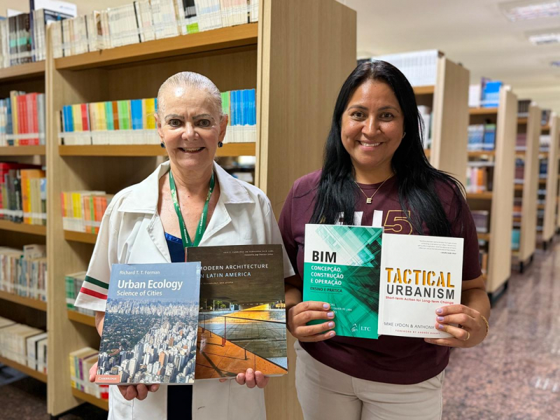A coordenadora do curso de Arquitetura e Urbanismo, Solange Smolarek, junto à bibliotecária Eliane Loureiro Padilha, receberam as novas obras. Os exemplares já estão disponíveis.