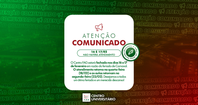 O Centro Universitário FAG informa que, em razão do Carnaval, haverá recesso acadêmico e administrativo nos dias 16 e 17 de fevereiro. As atividades serão retomadas normalmente na quarta-feira (18).