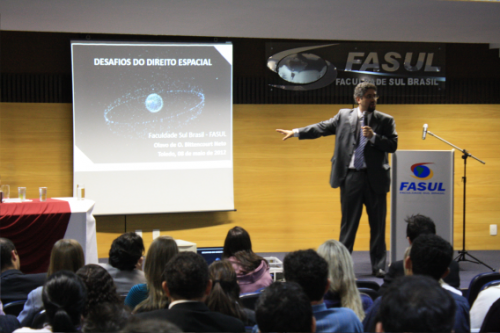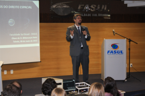 Nesta terça-feira (08) os acadêmicos de direito e demais autoridades estiveram acompanhando a fala do Dr. Olavo de Oliveira Bittencourt Neto - Doutor em Direito Internacional pela Universidade de São Paulo. Possui graduação em Direito pela Universidade de São Paulo (2001) e mestrado em Direito Internacional pela Universidade de São Paulo (2008), que explanou sobre um tema bastante interessante voltado aos entraves do Direito Espacial, onde muitos acreditam que seja somente em países do exterior este assunto é discutido, porém como bem lembrou o Dr. Olavo, o Brasil também possui um amplo programa ligado ao desenvolvimento espacial, e consequentemente está investindo nos debates em torno do Direito Espacial.