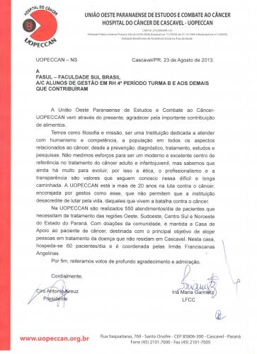 Os acadêmicos do 4º Período, turma “B” de Gestão de Recursos Humanos realizaram a arrecadação de alimentos destinados a Uopeccan de Cascavel, que busca atender a população com atendimentos de prevenção, diagnóstico, tratamento, estudos e pesquisas relativas ao câncer.