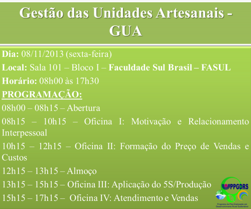 O curso de Administração irá realizar na próxima sexta-feira (8), o primeiro módulo do projeto de Gestão de Unidades Artesanais (GUA) em parceria com o Programa de Mestrado em Desenvolvimento Rural Sustentável e da Emater. A atividade será realizada na sala 101, no horário das 08h às 17h.