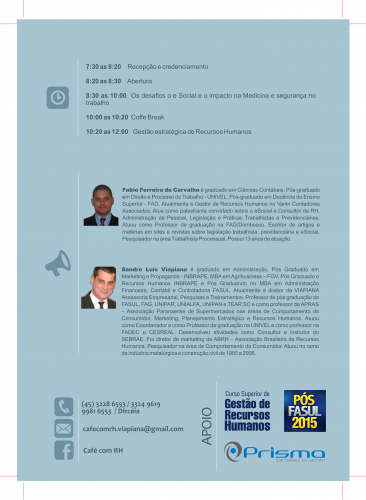 O Café com RH ocorre anualmente em Toledo e conta com a parceria da Faculdade Sul Brasil (Fasul), da Vanin Contabilidade e da Viapiana - Assessoria, Pesquisas e Treinamentos. O evento será realizado no dia 18 de novembro e serão realizadas palestras para o público presente.