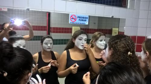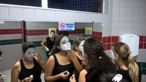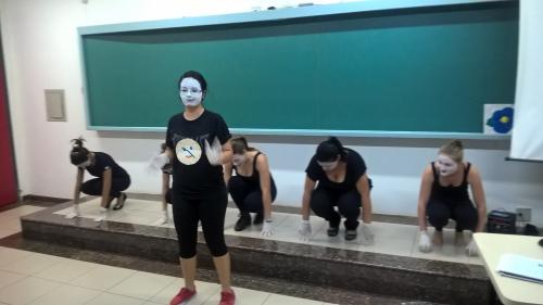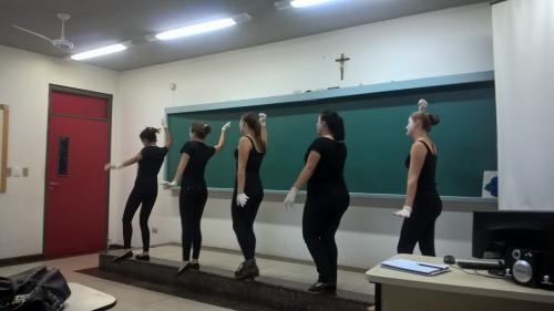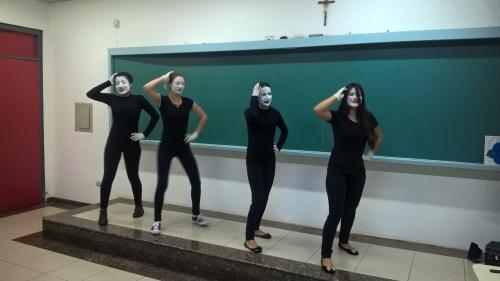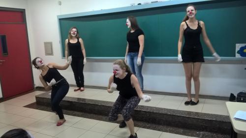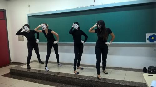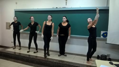 Como a característica de dramatizar é uma atividade coletiva, que acolhe a expressão individual, as estudantes do 2º período produziram mímicas a partir de músicas voltadas ao público infantil.