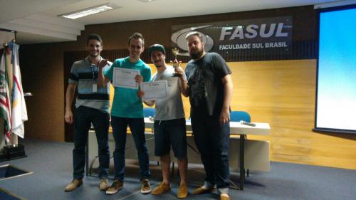 No primeiro lugar, com premiação de duas vagas na viagem para assistir ao programa do Jô Soares com passagem, hospedagem pagos e troféu, os estudantes Felipe Antônio Fachini Gabriel, do curso de Jornalismo e Alison Goris, de Publicidade e Propaganda.