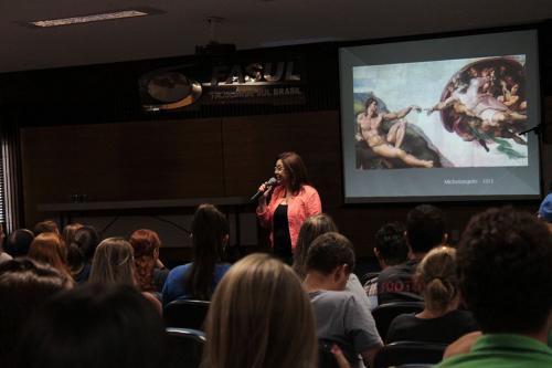 Com o tema “leitura, compreensão e interpretação: a formação do sujeito crítico em ensino superior”, a professora Patrícia Barth Radaelli ministrou uma palestra cheia de significados e referências que nortearam e cativaram os estudantes pela busca do aprendizado no ensino superior.