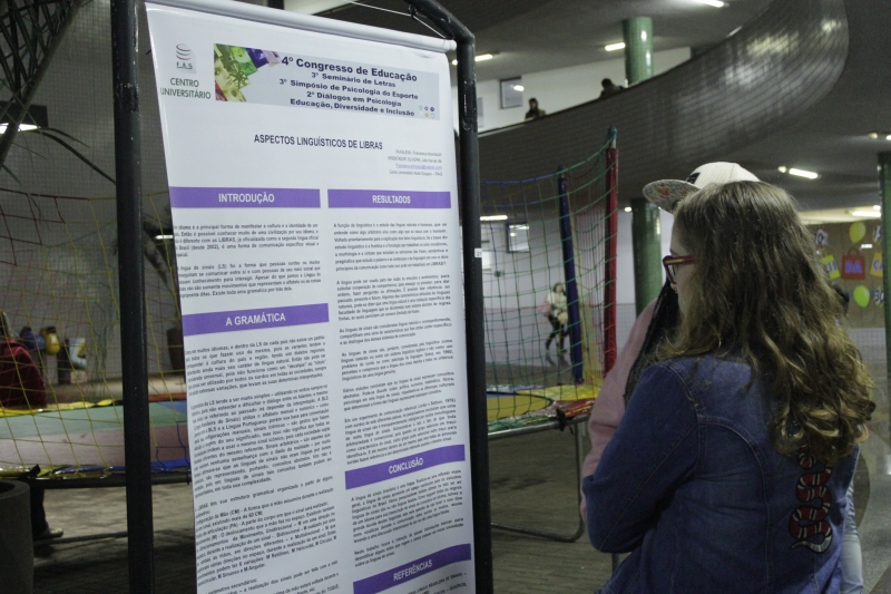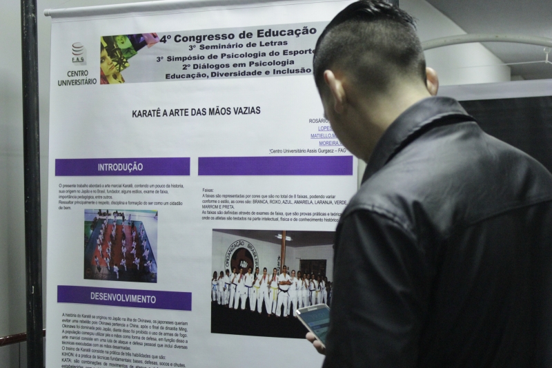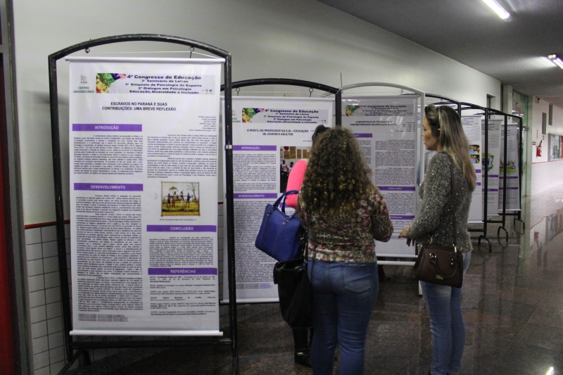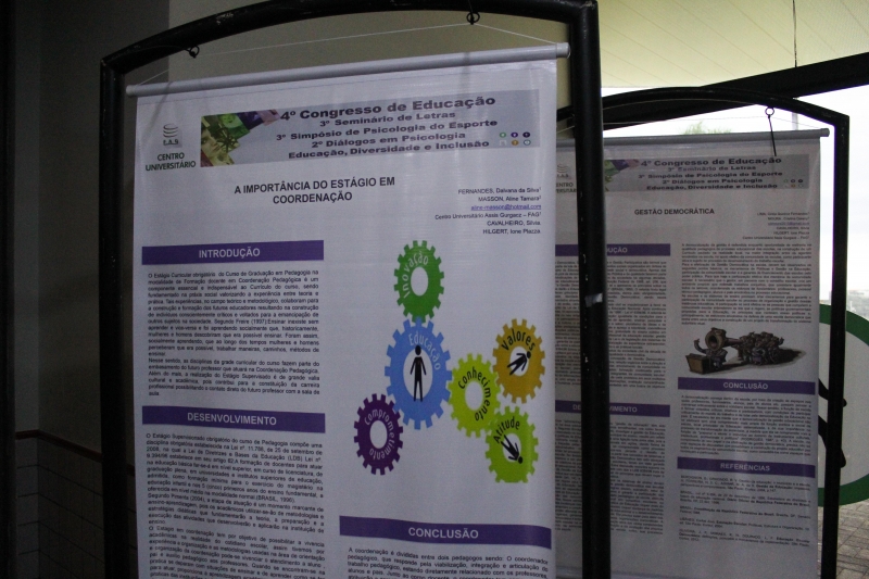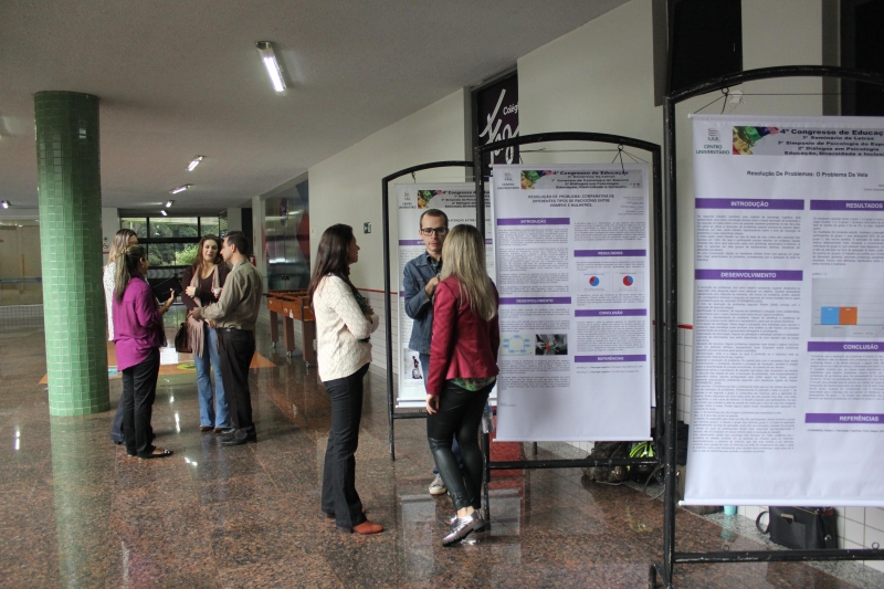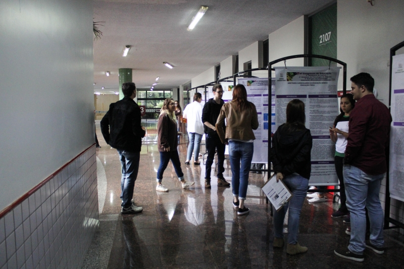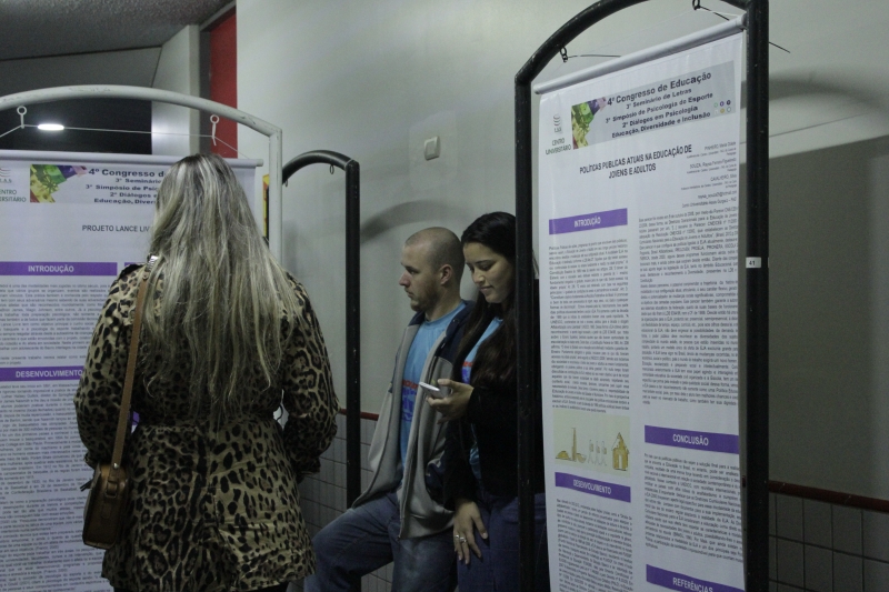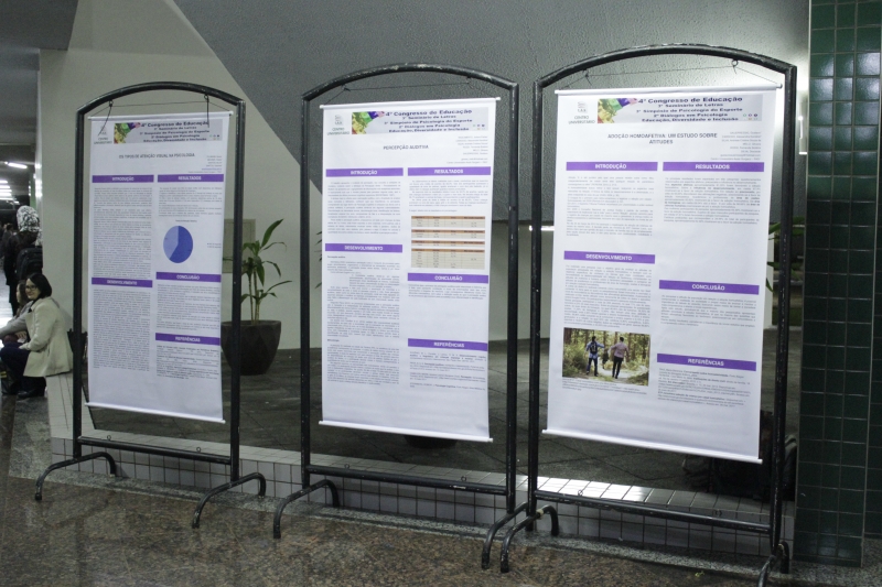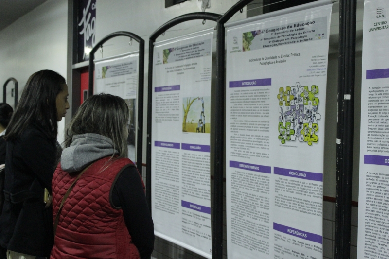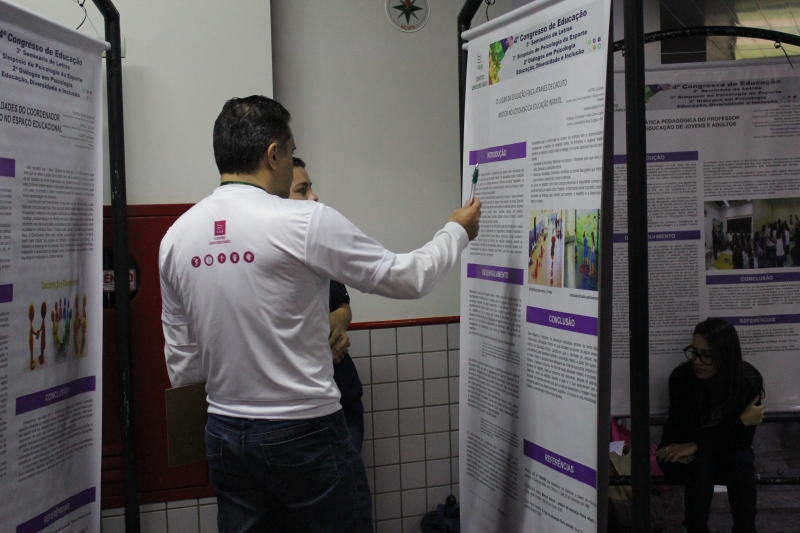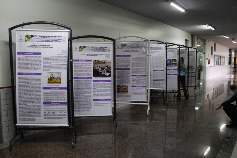 Os cincos cursos participantes do 4º Congresso de Educação (Pedagogia, Letras, Educação Física, Fonoaudiologia e Psicologia) desenvolveram pesquisas ao longo do semestre e apresentaram os banners no saguão do Bloco 2. As apresentações foram feitas para uma banca, que avaliou os mais de 200 trabalhos.