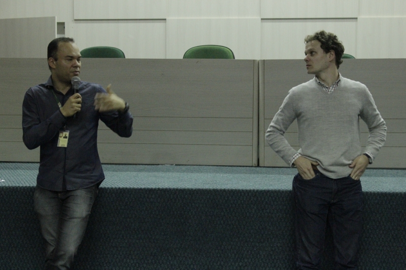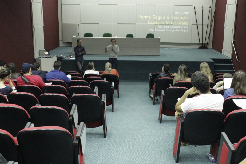 O professor Marcelo dos Anjos e o egresso e professor da Pós-graduação, Caio Smolareck Dias, foram os que conduziram o debate. "A fala é o resultado de uma pesquisa que estamos fazendo desde que o Studio CSD foi aberto sob minha gerência, em 2010. A pesquisa começou depois do concurso para o novo museu da Bauhaus em Dessau, em 2015, onde conseguimos aplicar estes conceitos ao máximo. Desde então esse virou o nosso lema, 'a forma segue a interação'", explica Caio. O arquiteto ainda fala sobre participar de iniciativas como essas. "A sensação de poder falar com a nova geração é muito refrescante", declara.