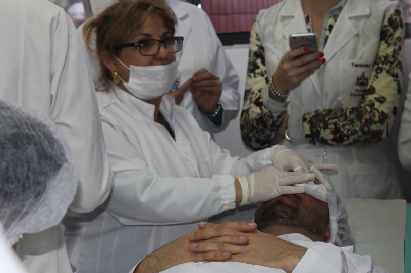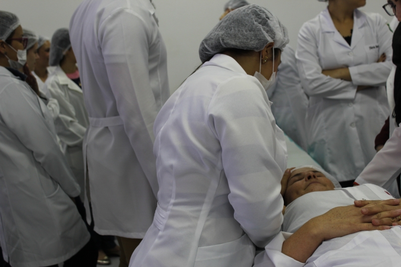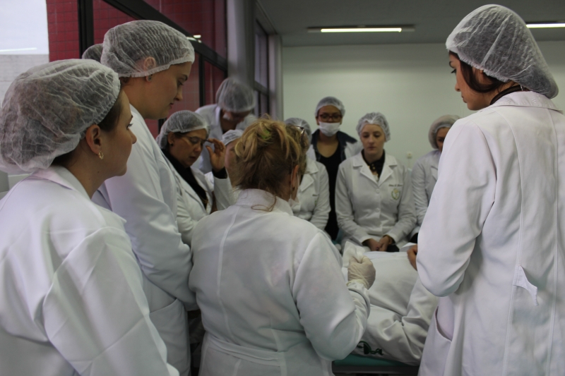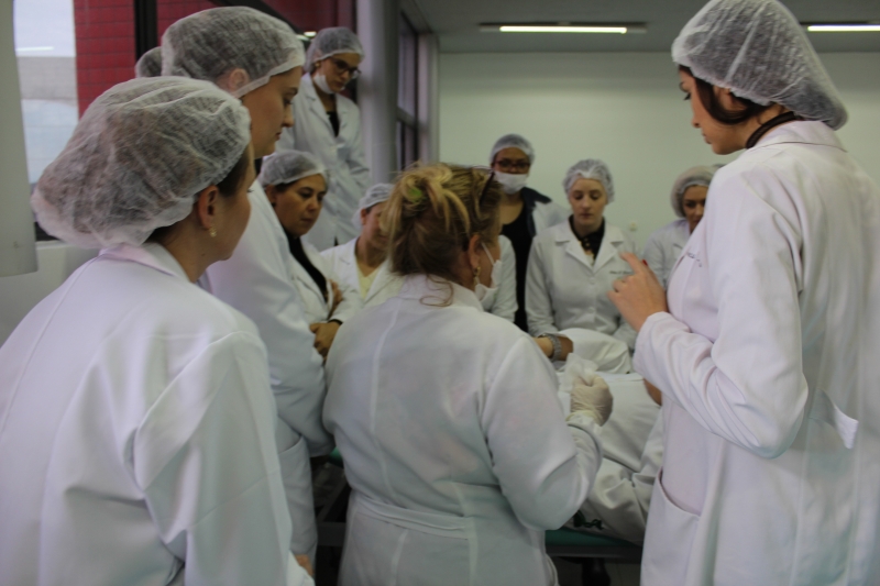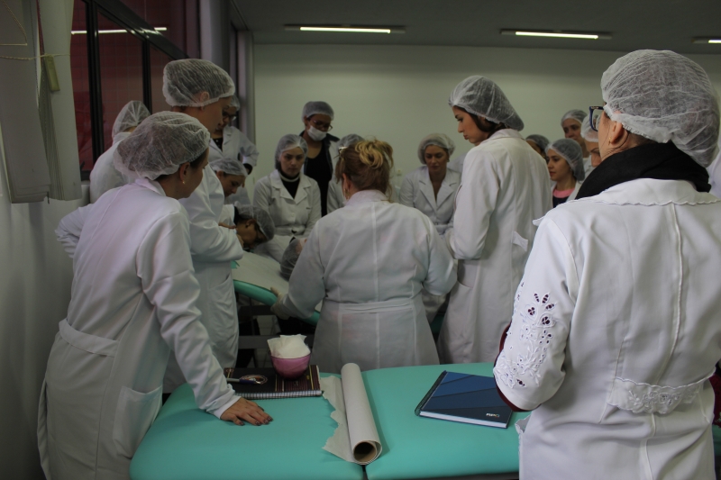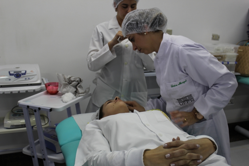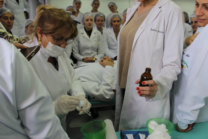 Depois da teoria em sala de aula, o grupo foi para o Laboratório de Estética. "Mostrei duas técnicas de acupuntura estética e, na sequência, fiz uma demonstração da absorção dos veículos ativos nos diferentes tipos de pele", conta. Os alunos participaram da demonstração.