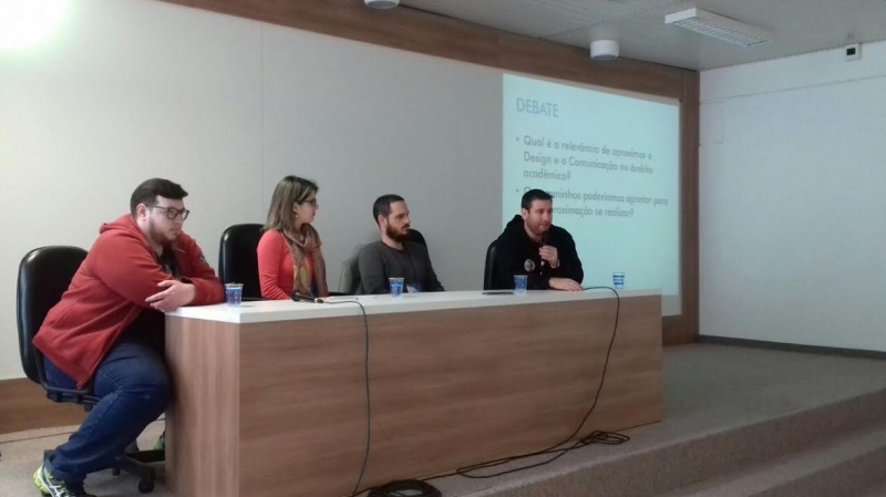 Participaram da mesa a professora Laila Rotter Schmidt, que mostrou dados sobre como Design e Comunicação estão próximos no mercado de trabalho, porém, distantes na área de pesquisa, e também os professores dos cursos de Publicidade e Propaganda e Design Gráfico do Centro FAG Sérgio Kulak, Fernando Frandoloso e Jeferson Richetti.