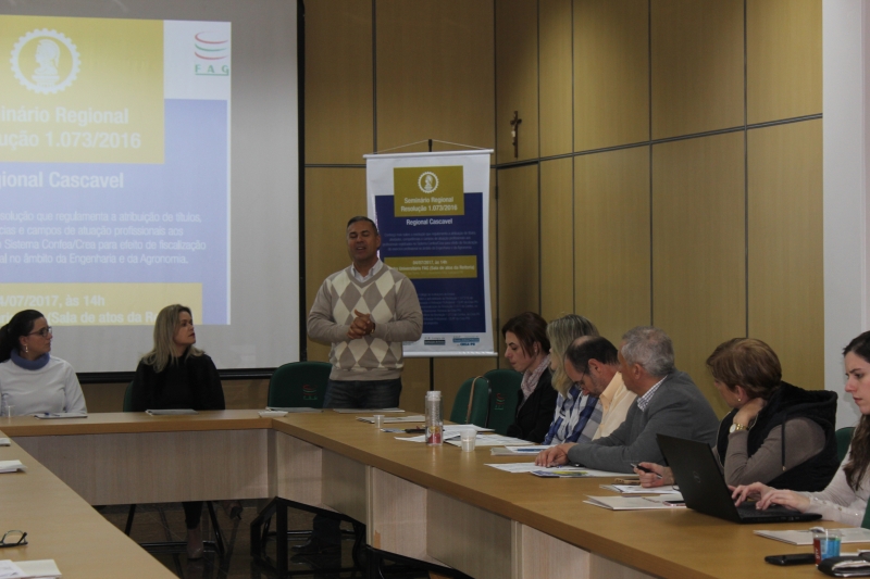 Desde o dia 20 de junho o Crea-PR (Conselho Regional de Engenharia e Agronomia do Paraná) realiza seminários regionais sobre a implantação da Resolução n° 1.073/2016, que regulamenta a atribuição de títulos, atividades, competências e campos de atuação aos profissionais registrados no Sistema Confea/Crea para efeito de fiscalização do exercício profissional no âmbito da engenharia e da agronomia. Na regional de Cascavel, o Centro Universitário FAG foi a sede do encontro, que contou com a participação de Coordenadores de professores do campus, além de representantes de Instituições de Ensino Superior de toda a região.