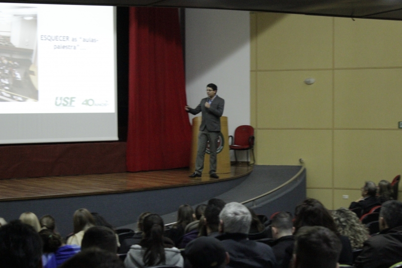E à noite, no Anfiteatro da Reitoria, Marcelo ministrou a palestra com o tema "Desafios da inovação pedagógica do século XXI: integração ensino - pesquisa - extensão". "Com os demais docentes, a estratégia foi apresentar os conceitos básicos da aprendizagem ativa, onde e como ser aplicado. A FAG está na vanguarda hoje das características do ensino superior inovador. Observo que são poucas as instituições que têm essa abertura e que investem na capacitação dos docentes", relata.
