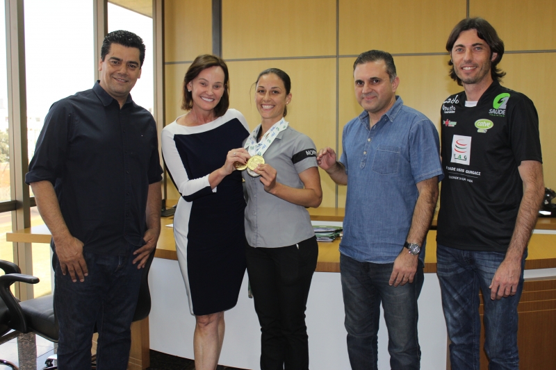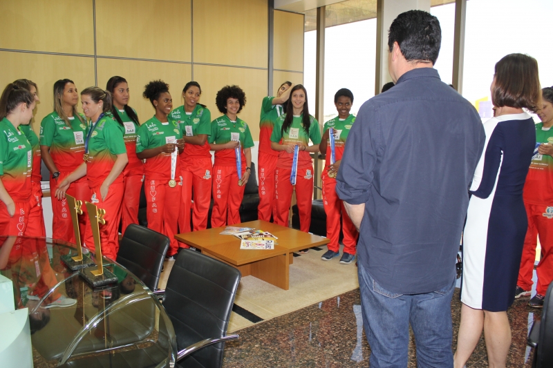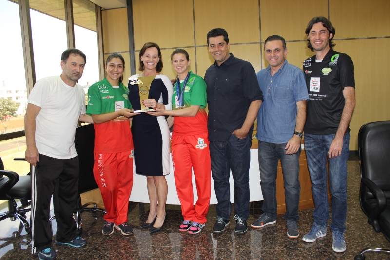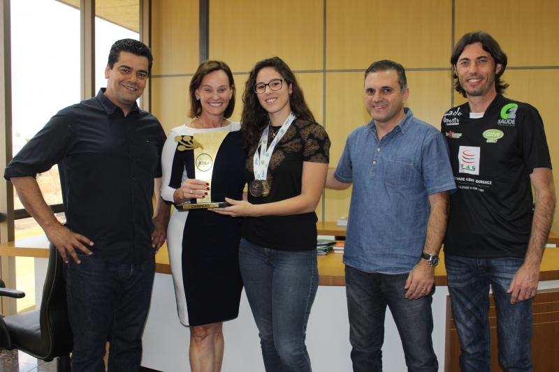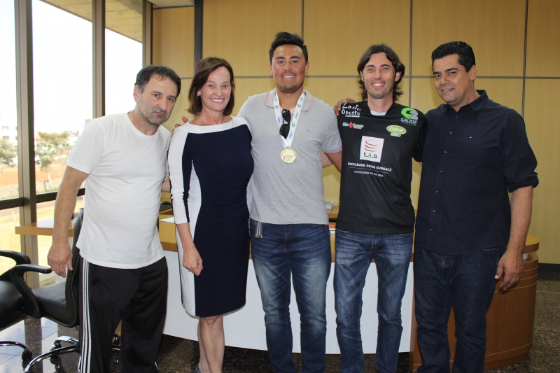 A Pró-Reitora Administrativa, Jaqueline Gurgacz Ferreira, e o Pró-reitor Acadêmico, Afonso Cavalheiro Neto, receberam as premiações das mãos dos atletas e também do Coordenador de Educação Física, Vitor César Moreira, e dos professores que acompanharam as equipes na viagem, Neudi Zenatti e Lissandro Dorst.