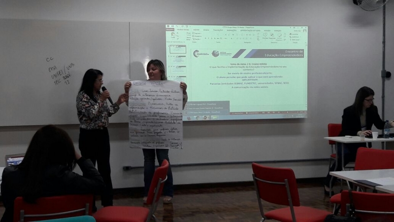 O encontro foi dividido em dois momentos: pela manhã professores e diretores apresentaram suas propostas. Já à tarde, seis mesas foram montadas para grupos de trabalhos - dois grupos para o Ensino Fundamental, dois para o Ensino e Médio e dois para o Ensino Superior. "Discutimos ações que podem facilitar o processo de inclusão da Educação Empreendedora na região Oeste. No geral, discutimos coisas que atrapalham e também questões que favorecem. O bacana foi falar sobre como usar as tecnologias para divulgação", explica a professora, Luciana Ferraz.