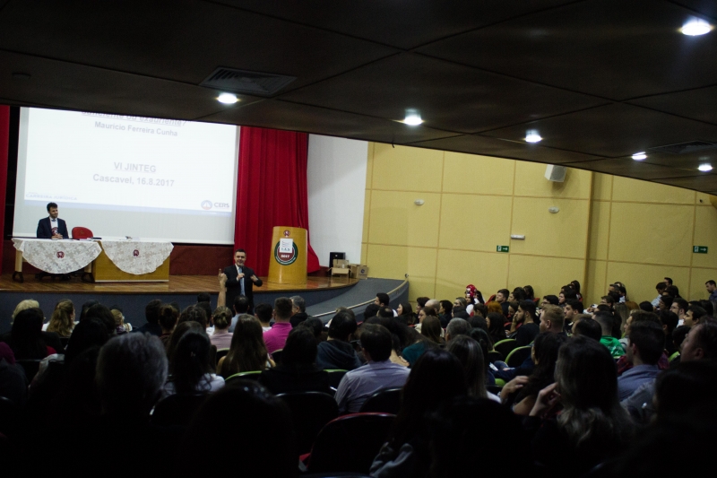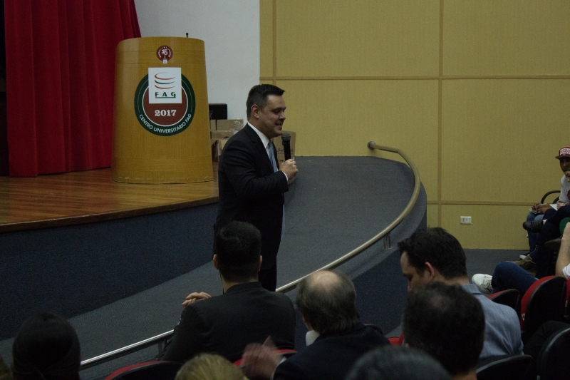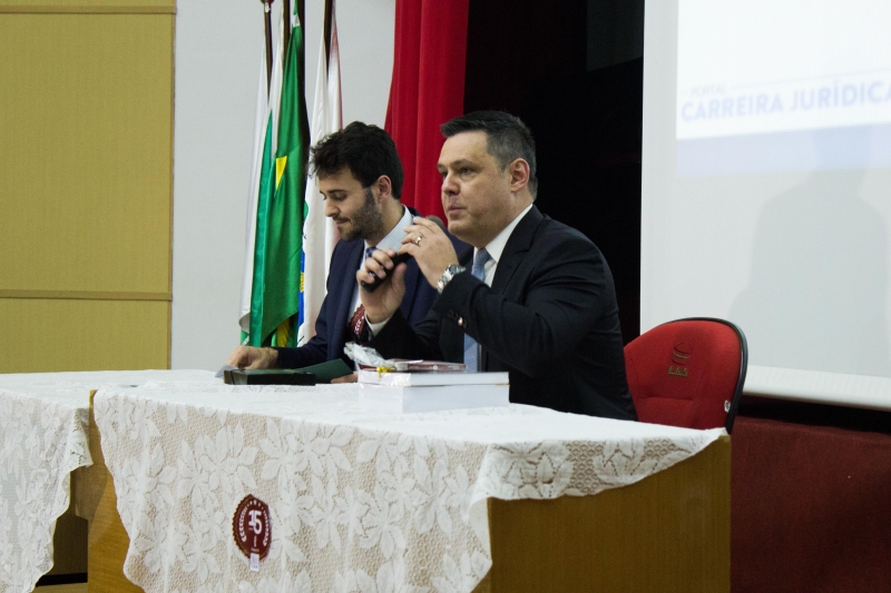 À noite, foi a vez de Maurício Cunha, Juiz de Direito no Tribunal de Justiça de Minas Gerais, Doutor em Direito Processual falar sobre "Fundamentação das Decisões Judiciais: suficiente ou exauriente?". "Os alunos estão mais acostumados com um viés teórico, então eu trouxe um lado prático, para que eles possam ter essa noção maior. São situações que eu vivencio como juiz, como professor universitário também", fala. "O convite para o Doutor Maurício começou com a comemoração dos nossos 15 anos, pois ele é bastante conhecido pelo seu profundo conhecimento sobre o Processo Civil. Tenho certeza que os acadêmicos saíram daqui ainda mais apaixonados pelo Direito?, conta a Coordenadora Viviana Bianconi. ?A iniciativa da FAG só vem a acrescentar o nosso entendimento como futuros bacharéis em Direito. Muitos acadêmicos acompanham já a trajetória do Doutor Maurício e as ideias dele são bem à frente do seu tempo. Isso nos aproxima do que realmente é a carreira jurídica?, elogia a Presidente da Atlética de Direito, Ana Caroline Welter.