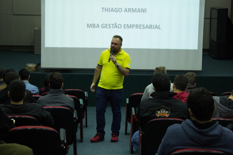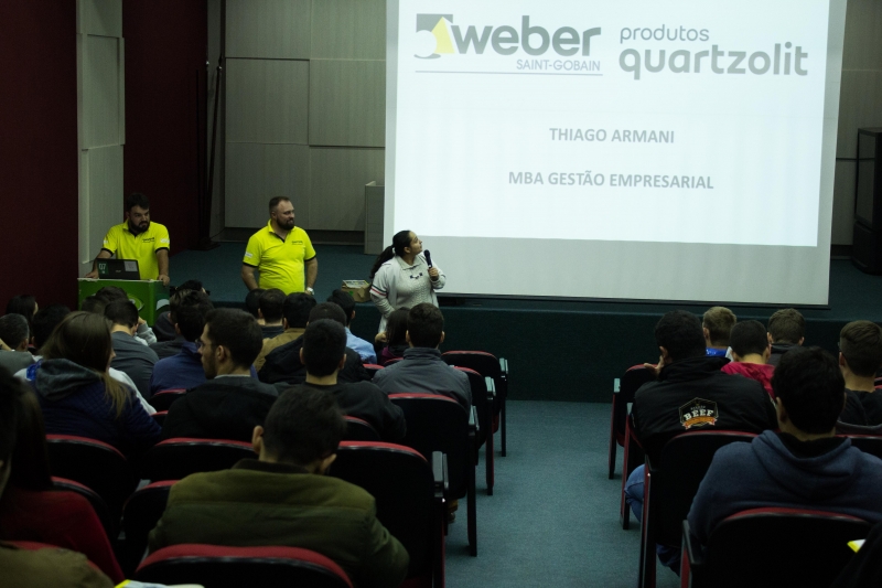 Quem dirigiu a fala aos alunos, de uma forma bem descontraída, foi um dos representantes da Quartizolit, Thiago Armani. Thiago tem MBA em Gestão Empresarial. "Percebemos as constantes mudanças quando visitamos as obras. Vim para auxiliar os futuros profissionais mostrando nosso trabalho e nossos produtos", conta.