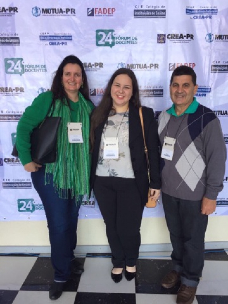A egressa de Agronomia, Andreia Sandri, a Coordenadora do curso do Centro Universitário FAG, Ana Paula Morais Mourão Simonetti, e o professor da graduação e conselheiro do CREA-PR, Laercio Boschini, estiveram na semana passada no 24º Fórum de Docentes do CREA-PR, que aconteceu em Pato Branco. Andreia esteve no evento para apresentar o melhor TCC de Agronomia do Paraná, segundo o Conselho. A escolha aconteceu no início do mês e levou em consideração os seguintes critérios: aplicabilidade do conhecimento técnico na prática profissional, o grau de inovação e o nível de abrangência do tema.