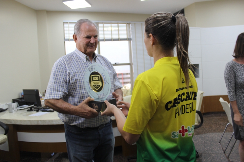 Equipe de Handebol entrega troféu da LDU ao Reitor