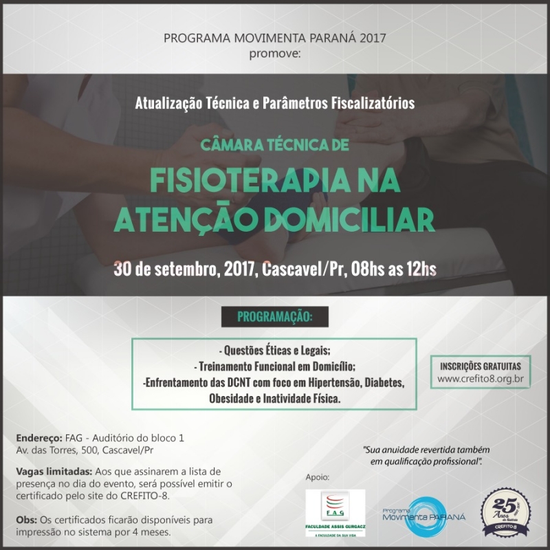 O Centro Universitário FAG será sede, no próximo sábado (30) da Atualização Técnica e Parâmetros Fiscalizatórios da Câmara Técnica de Fisioterapia na Atenção Hospitalar, que está sendo organizado pelo Crefito 8 (Conselho Regional de Fisioterapia da 8ª Região). O evento acontece no Auditório do Bloco 1, das 8h às 12h.