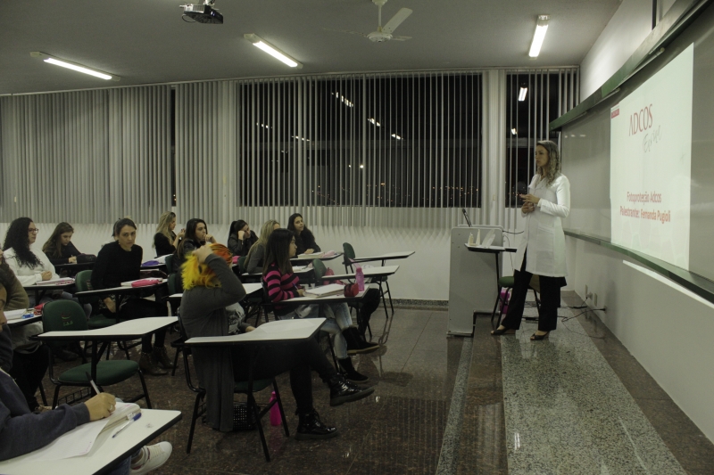 A esteticista, Fernanda Puglioli, da ADCOS Cosméticos, falou às acadêmicas do 2º período