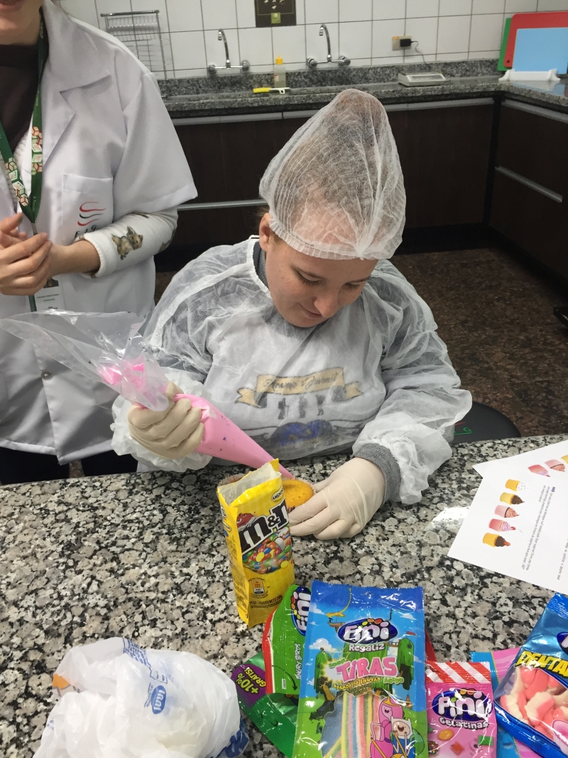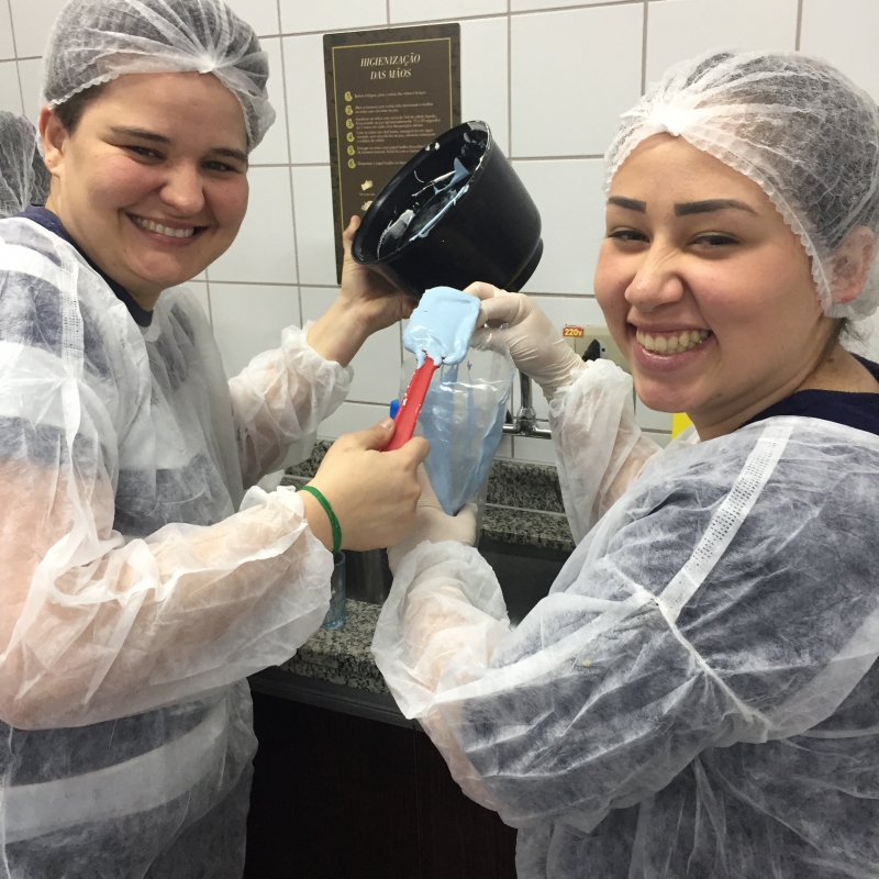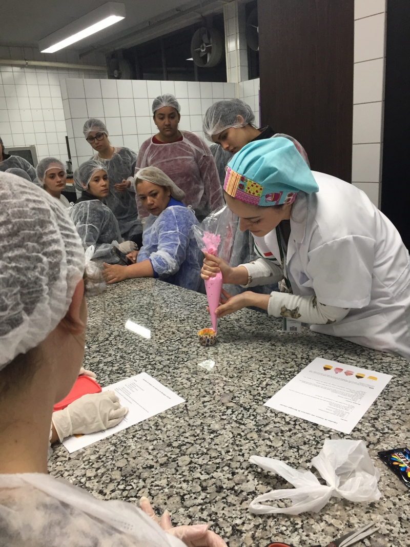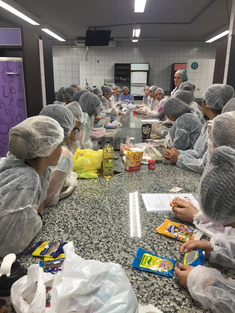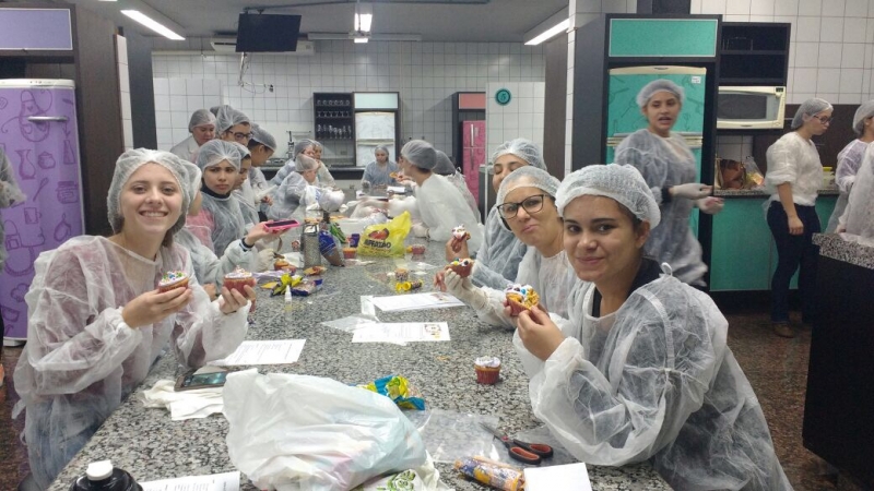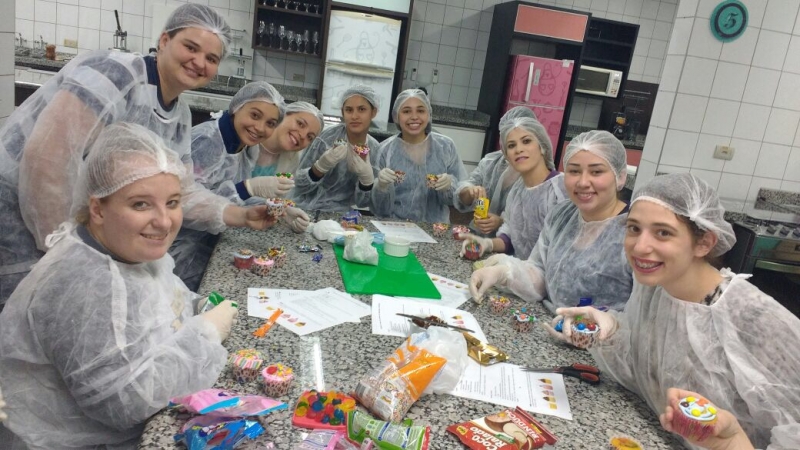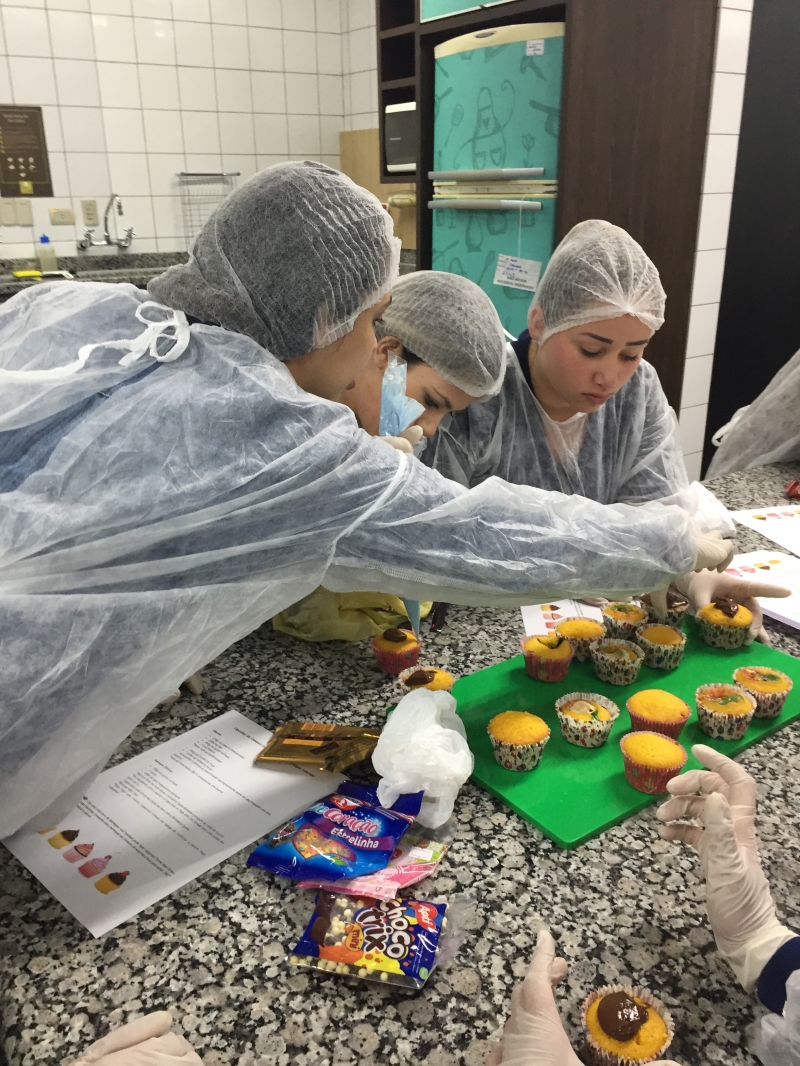 O Laboratório de Nutrição do Centro FAG, que fica no Bloco IV, foi espaço de muito aprendizado para a turma do 2º período do curso de Pedagogia. Os estudantes, literalmente, colocaram a mão na massa. Eles tiveram que criar uma linha de produção de cupcakes em que aplicaram as técnicas da Língua Portuguesa.
