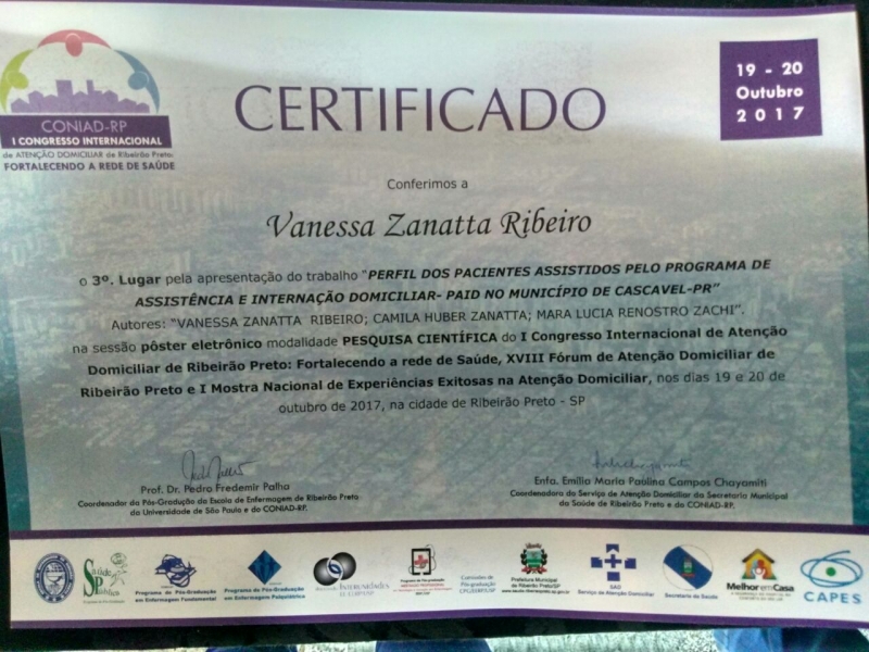 O trabalho intitulado "Perfil dos Pacientes Assistidos pelo Programa de Assistência e Internação Domiciliar (PAID) no Município de Cascavel" foi escrito pelas acadêmicas, Vanessa Zanatta Ribeiro e Camila Huber Zanatta, com a orientação da professora Mestre, Mara Lúcia Renostro Zachi. A premiação aconteceu na sessão pôster eletrônico, modalidade pesquisa científica.