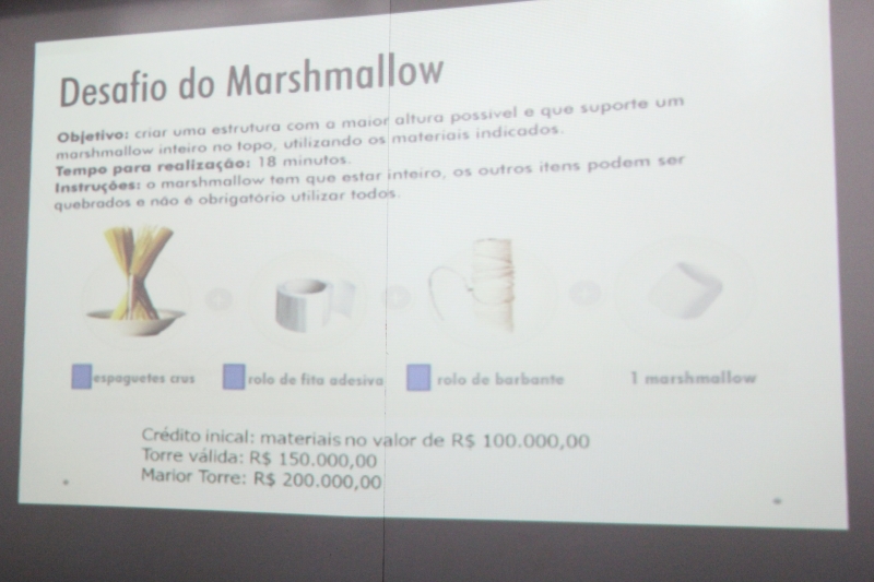 A consultora trouxe aos estudantes o "desafio do marshmallow", em que eles tiveram que criar uma estrutura com a maior altura possível e que suportasse um marshmallow inteiro no topo, utilizando os seguintes materiais: espaguetes crus; barbante; fita adesiva e um marshmallow. "O objetivo da atividade foi descobrir comportamentos que eles já têm e comportamentos que podem ser desenvolvidos", explica Stefania.