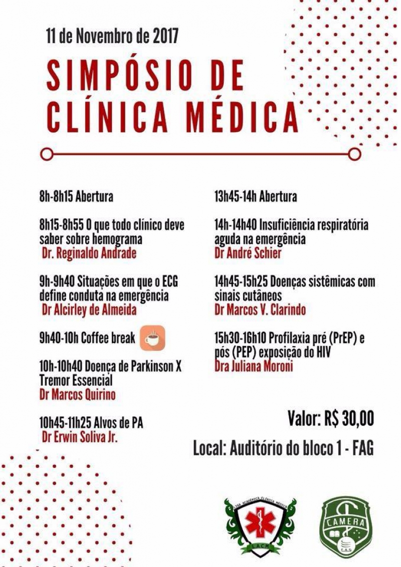 O Centro Universitário FAG será palco para o I Simpósio de Clínica Médica que acontece sábado, dia 11 de novembro, no Auditório do Bloco I. A realização do evento é uma iniciativa da LACM (Liga Acadêmica de Clínica Médica) em parceria com a Camera (Centro Acadêmico de Medicina Rui Almeida).