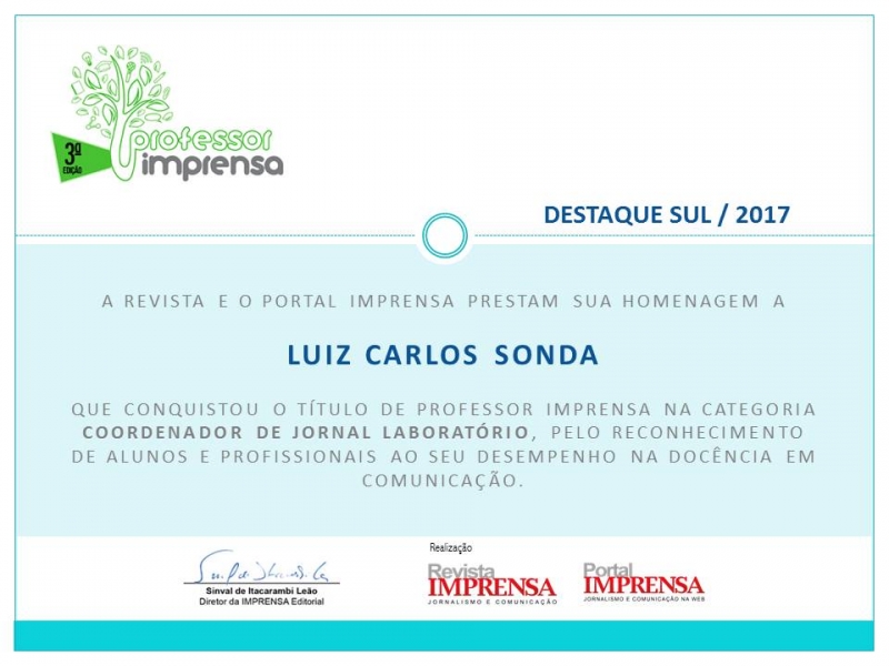 O Prêmio Professor Imprensa é realizado pela Revista e Portal Imprensa. A iniciativa homenageia os docentes e projetos mais admirados dos cursos de Comunicação do país. Em um primeiro momento, o Prêmio contou com indicações espontâneas de alunos de ex-alunos. Na sequência, a votação foi aberta ao público em geral. "Além de contarmos com os votos de nossos alunos e egressos, tivemos também muitos votos dos colegas do Centro FAG, que vêm esse projeto acontecer diariamente", pontua Sonda.