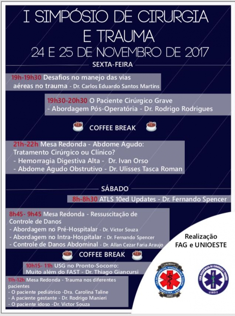Os cursos de Medicina do Centro Universitário FAG e da Unioeste (Universidade Estadual do Oeste do Paraná) promovem, neste fim de semana, o I Simpósio de Cirurgia e Trauma. O evento é em parceria com a Liga Acadêmica de Urgência e Trauma do Centro FAG, Liga Acadêmica de Cirurgia e Trauma da Unioeste e do Centro Acadêmico de Medicina Rui Almeida.