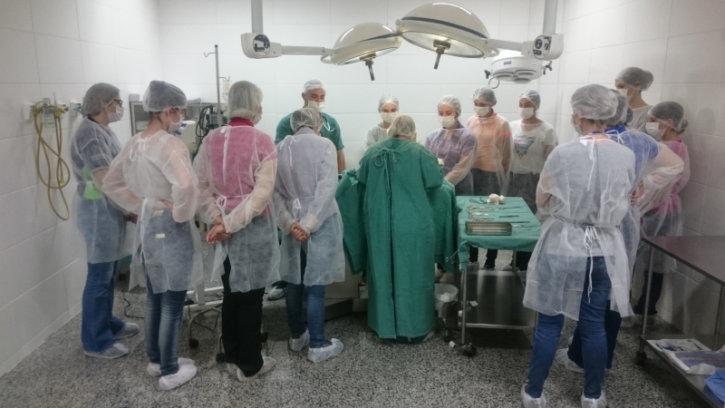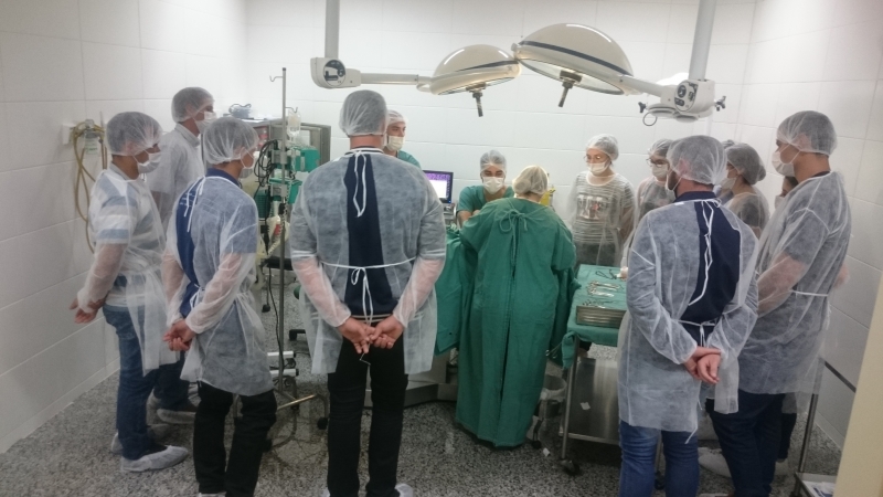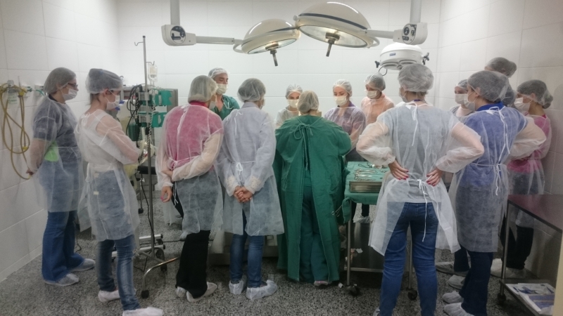 A visita começou pelo Hospital Veterinário da FAG. Eles assistiram a dois procedimentos: a extração de tártaro de um cachorro e a retirada de um cisto de uma gata. Eles também receberam orientações sobre a graduação de Medicina Veterinária dos professores, Luiz Gracioli e Rodrigo Neca Ribeiro, além do Coordenador do curso, Adriano Ramos.