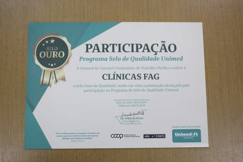 A Unimed Cascavel realizou uma cerimônia de entrega do Selo de Reconhecimento aos prestadores já classificados com o Selo Ouro e inseridos no Programa Selo de Qualidade Unimed. A Clínica de Fisioterapia da FAG foi um dos serviços que receberam a certificação de qualidade.
