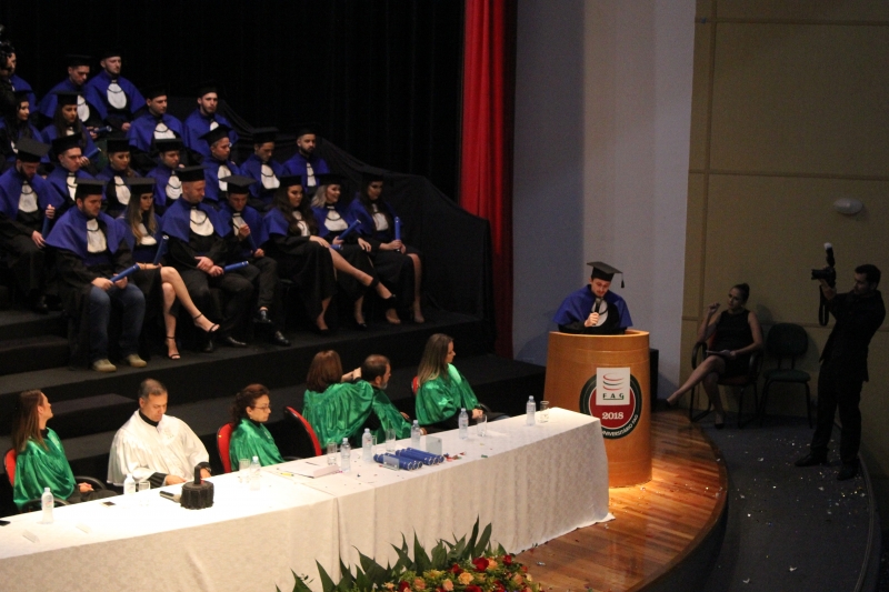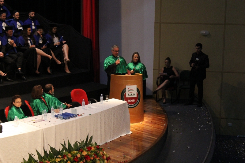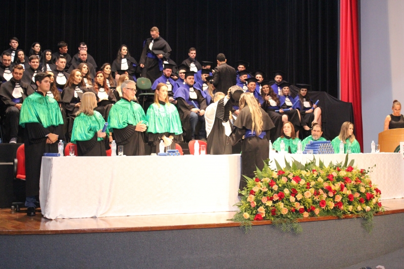 A mesa dos trabalhos foi composta pelo presidente da sessão, o Vice-reitor, Sergio De Angelis; pela secretária acadêmica, Maria Madalena de Camargo; pela coordenadora do curso, Aline Gurgacz Ferreira Meneghel e pelos professores homenageados da Turma I, Eudiman Heringer, Claudia Sauter e In Memoriam: Vitor Augusto Cunha da costa, neste ato representado pelo seu pai: Augusto Fonseca da Costa e, da Turma II, Andreia Helena Pasini, Mario Hermoso, Tania Mara Smaniotto Silveira.