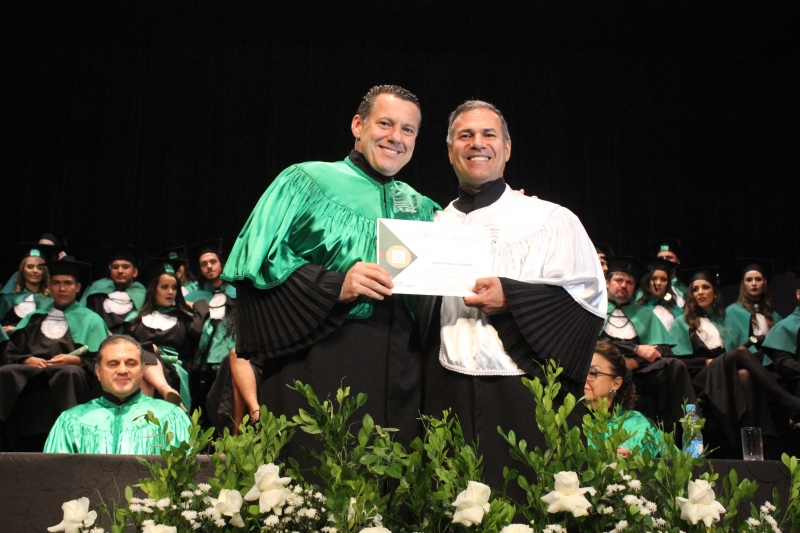 A mesa de honra foi composta pelo Pró-Reitor Acadêmico, Afonso Cavalheiro Neto, junto a Secretária Acadêmica, Maria Madalena de Camargo, do Coordenador Vitor Cesar Moreira e dos professores homenageados: Everton Paulo Roman, Roberto Regis Ribeiro, Dirléia Sbardelotto, Gleison Miguel Lissemerki Ferreira, Hani Zehdi Amine Awad - representado pelo professor Alceu Martins Junior. Os Bacharéis em Educação Física receberam o Registro do CREF, entregue pelo representante do CREF 9/PR (Conselho Regional de Educação Física da 9ª Região do Estado do Paraná), Sr. Idalino Pietch.