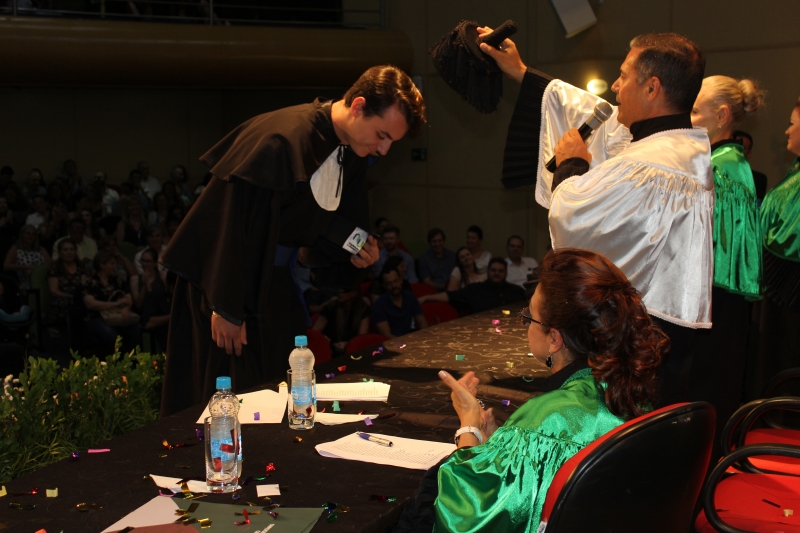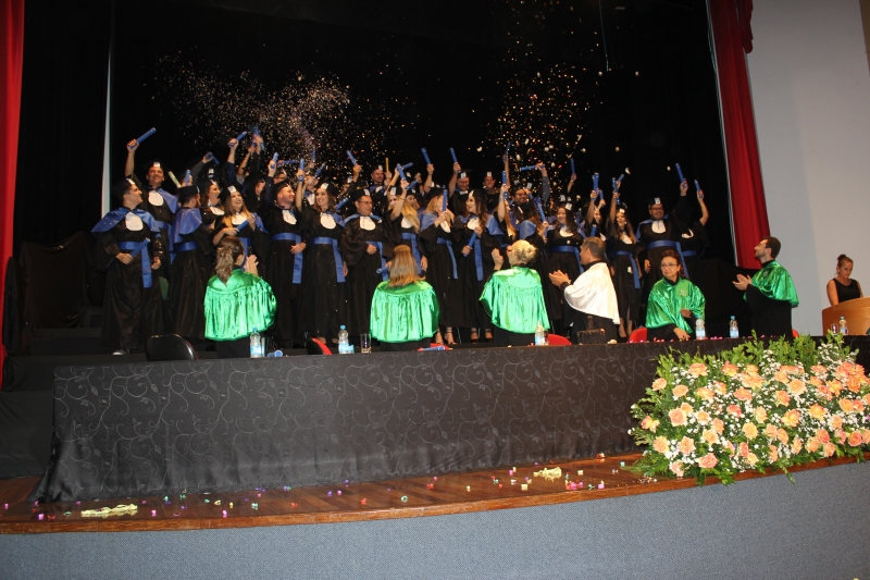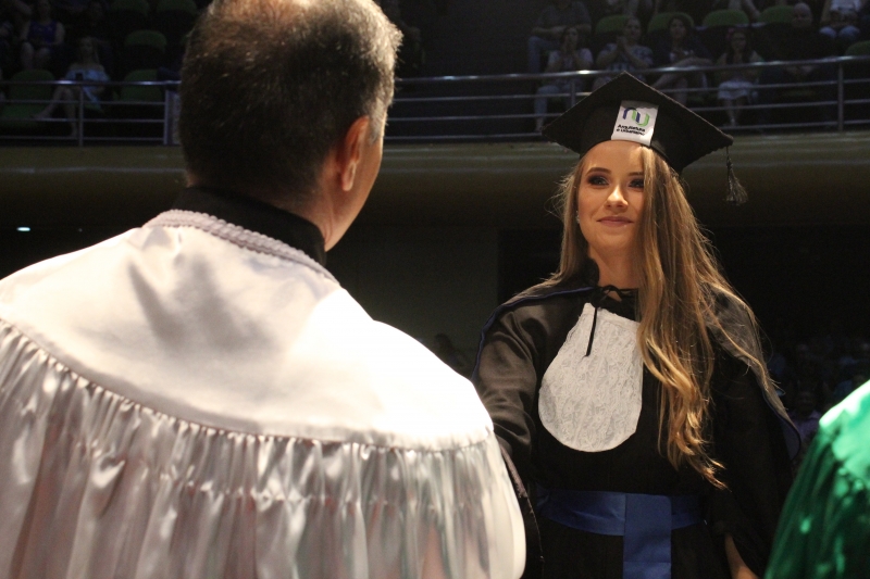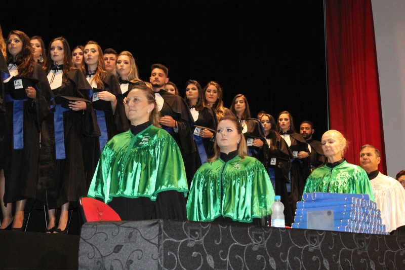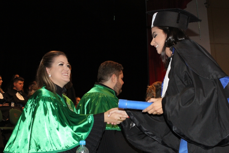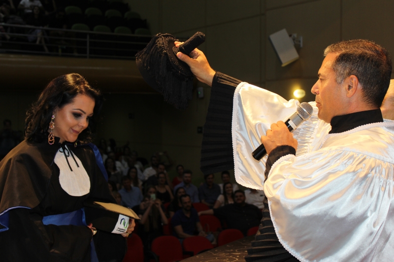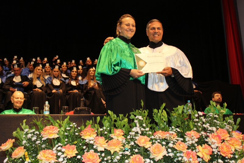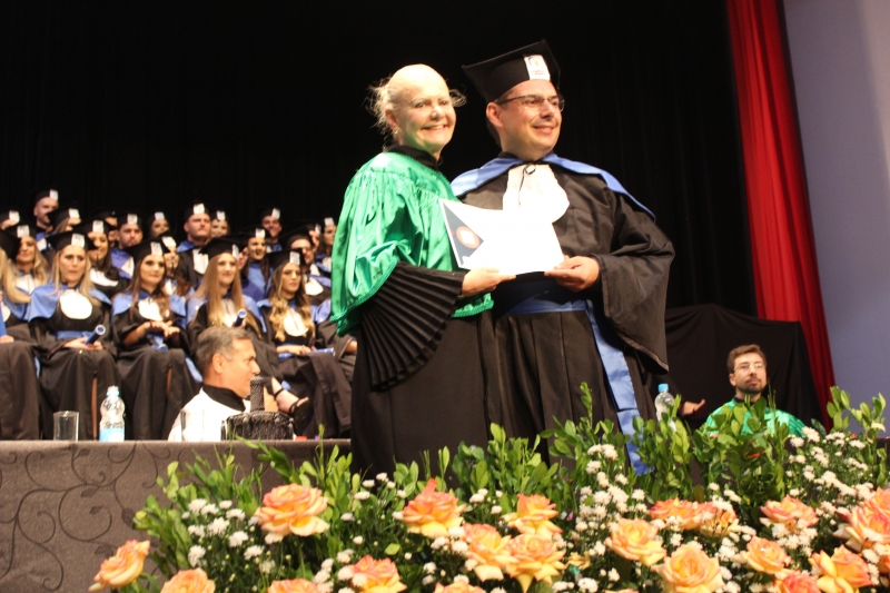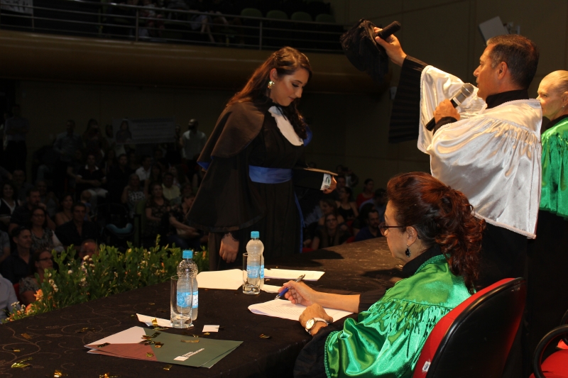 A outorga de grau foi concedida pelo Vice-Reitor, Sérgio De Angelis, que compôs a mesa de trabalhos ao lado da Secretária Acadêmica, Maria Madalena de Camargo, da coordenadora, Solange Smolarek Dias e dos professores homenageados.