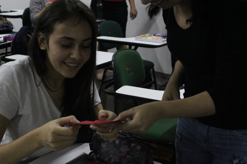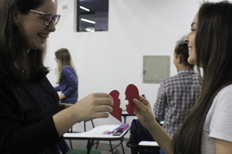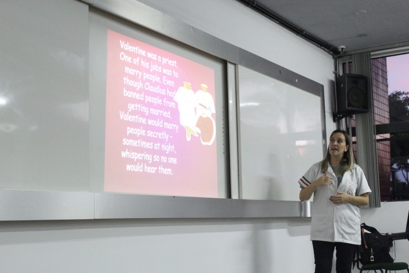 Patrícia contou aos alunos a história da data - 14 de fevereiro - que se comemora o dia dos enamorados em vários países. Aqui no Brasil é festejada no dia 12 de junho. ?O objetivo da dinâmica foi, além de trazer a história da origem do Valentine's Day, proporcionar aos acadêmicos um momento de "ice breaker" (quebra-gelo), para eu pudessem se conhecer melhor. Dessa forma, envolvemos o conhecimento cultural, confraternização e chocolates", explica a professora.