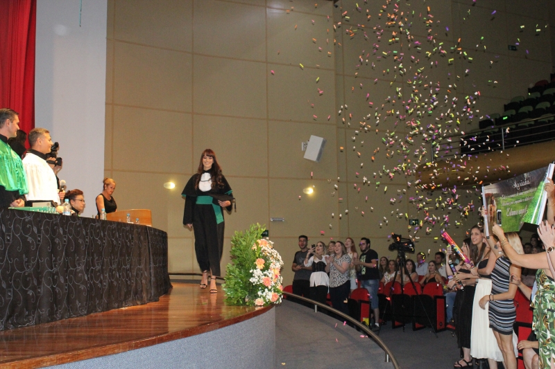 A formanda da Turma 02, Débora Aparecida de Oliveira, em seu discurso, lembrou que quando iniciaram a turma era grande. "Começamos com uma sala cheia, e com o passar do tempo diminuiu, mas fomos cada vez mais nos aproximando. Nesses cincos anos aconteceram diferentes coisas, e o engraçado é que nas semanas de provas no uníamos mais ainda. Foram várias emoções e agora cada um segue seu caminho sozinho e a saudade começa a bater", declara.