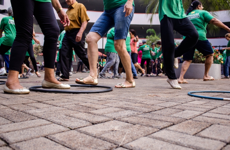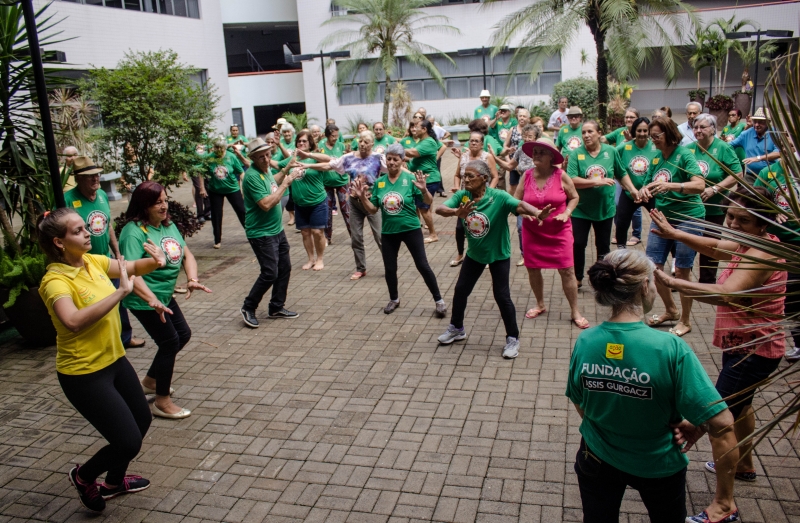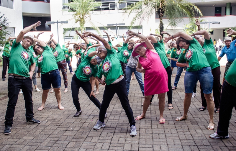 Os idosos já iniciaram o ano com agitação: eles participaram de brincadeiras e de alongamentos cheios de animação.