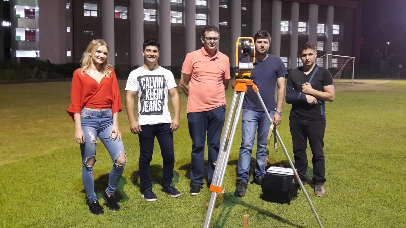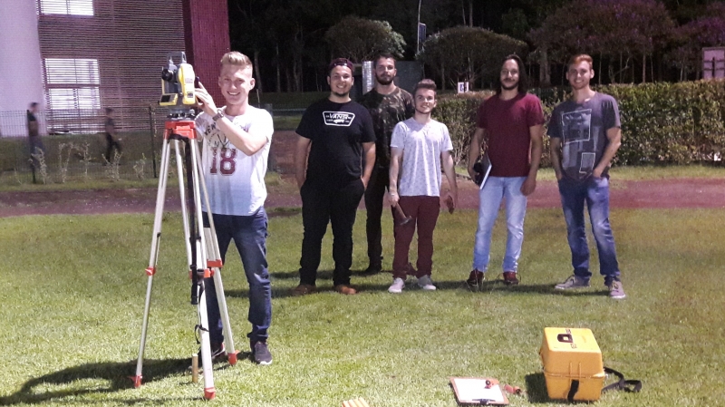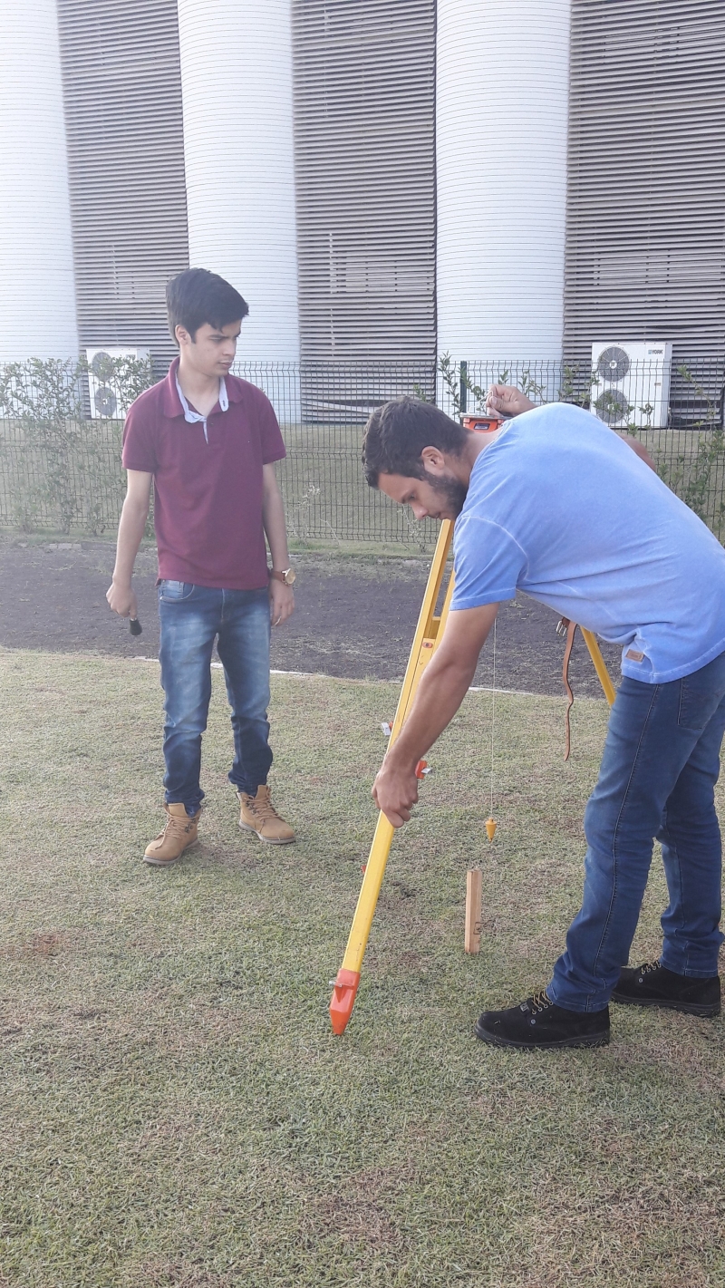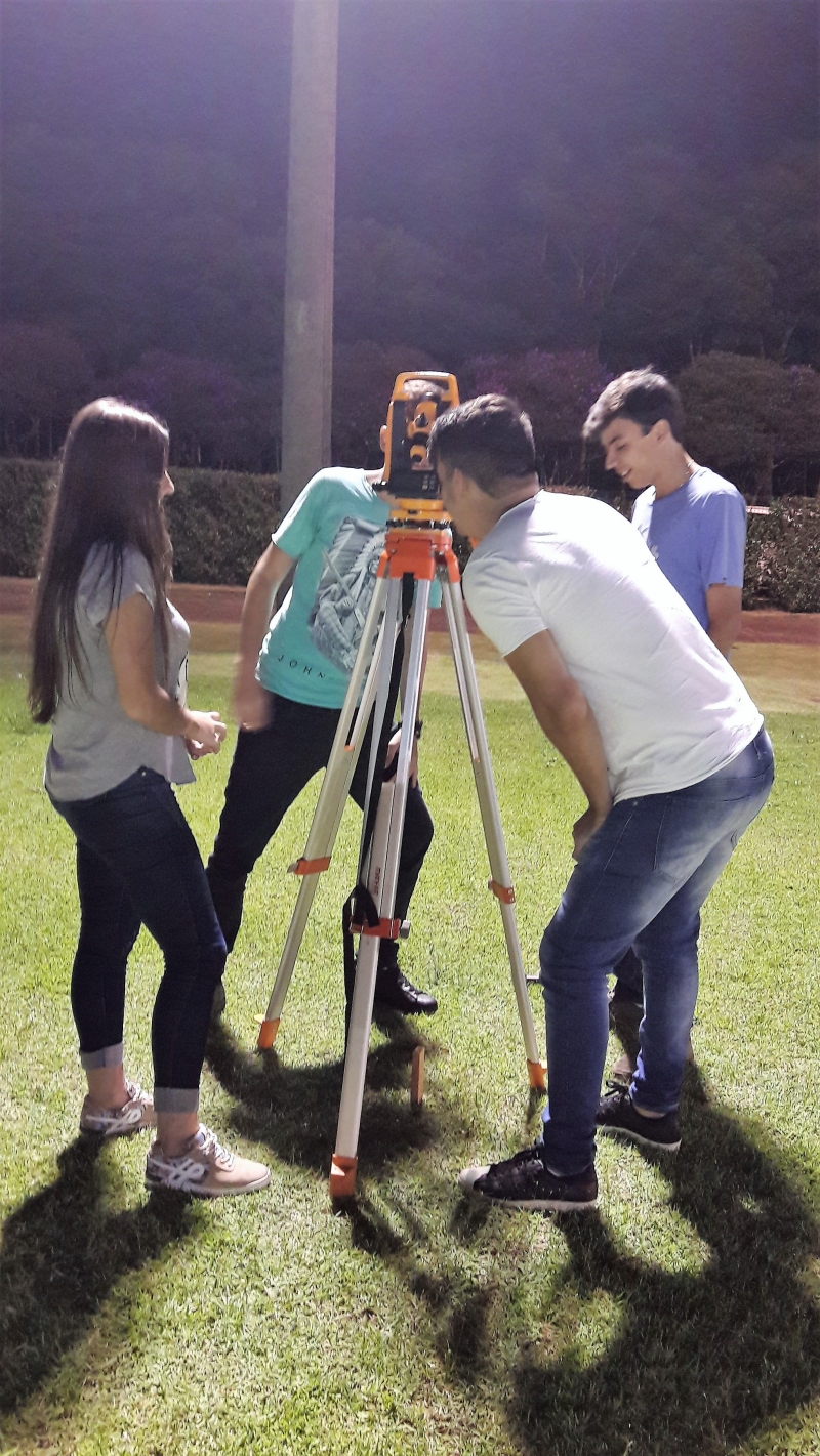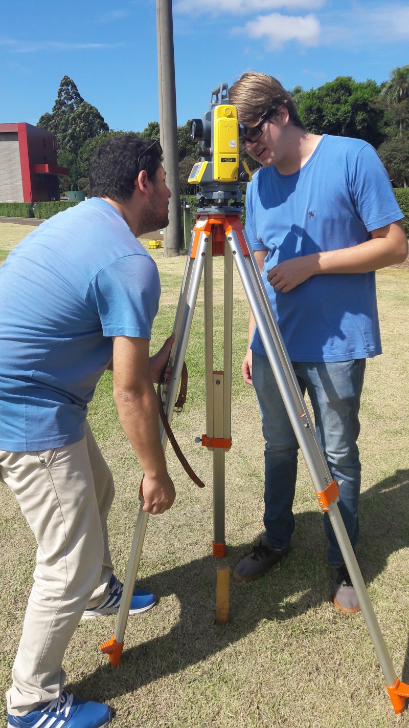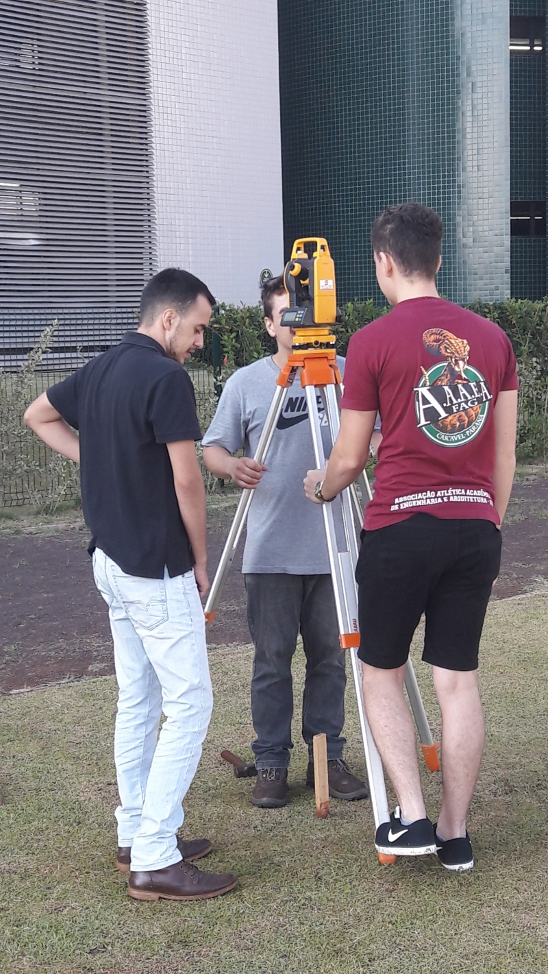Os alunos do 3° Período de Engenharia Civil (T01 e T02) do Centro Universitário FAG realizaram aula prática na disciplina de Topografia. A intenção foi fazer a montagem, nivelamento e ajuste do prumo óptico sobre um ponto topográfico. A matéria é ministrada pela professora, Joseane Bortolini.