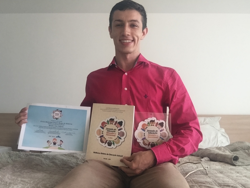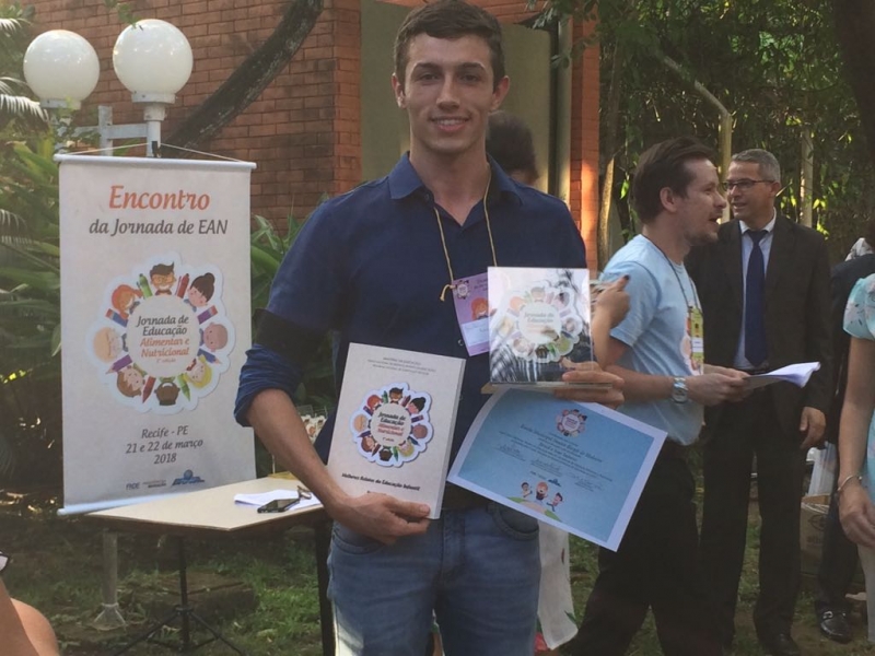 Guilherme venceu um concurso no ano passado em que criou um projeto de educação nutricional para crianças e foi aceito no Programa Nacional de Alimentação Escolar. A prática realizada com alunos da escola Dr. Borges de Medeiros, em Toledo, contou com atividades lúdicas, que demonstraram a importância da alimentação saudável nas escolas. "Em Recife foi um encontro para receber o certificado, troféu e livro dos 30 relatos. E também apresentação dos melhores relatos de cada tema, o 1º lugar de cada um. No meu caso eu fiquei em 1º no tema 2: Alimentos Regionais Brasileiros. Então teoricamente meu projeto ficou entre os 6 melhores do Brasil", celebra.