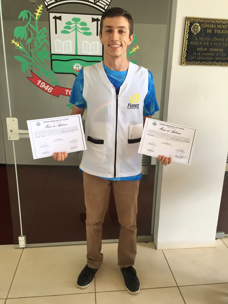 Nesta semana, o jovem foi recebido, em Toledo, pela Câmara de Vereadores. "Recebi da vereadora Marli do Esporte uma moção de aplausos da Câmara, por representar de forma nacional a educação e o nome do município, com premiações de renome pelo MEC/PNAE/FNDE", relata. A próxima etapa é participar do Congresso Brasileiro de Nutrição (COBRAN), que acontece entre os dias 18 e 21 de abril, em Brasília.