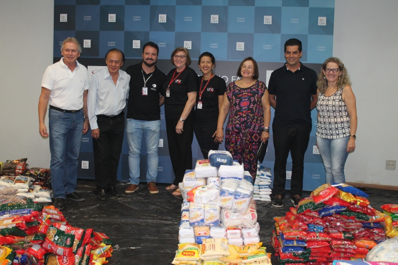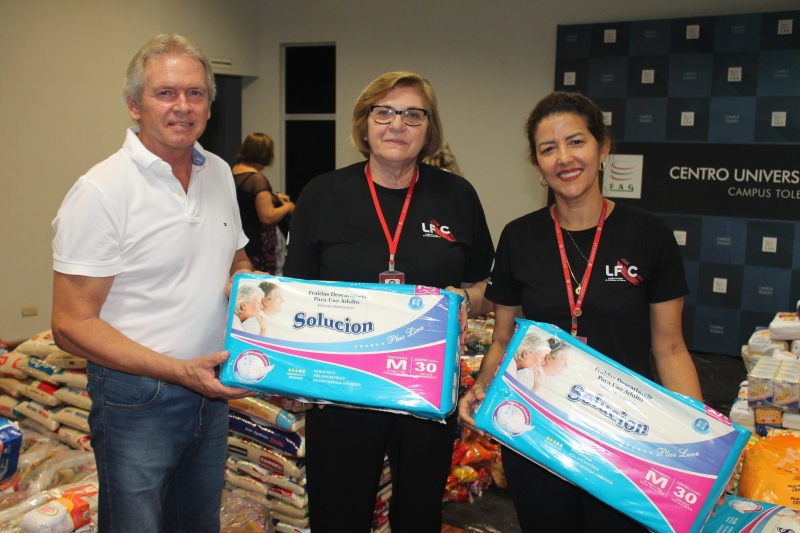 A FAG Toledo realizou na noite sexta sexta-feira (13) a entrega dos donativos arrecadados no Trote Solidário 2018. Foram seis toneladas de produtos arrecadados com aproximadamente três mil fraldas geriátricas. Os donativos foram repassados pelo diretor da FAG Toledo Ildo Bombardelli, pelo Pró-reitor Acadêmico Afonso Cavalheiro e pela coordenadora pedagógica da FAG Toledo Janice Salvador aos representantes da Uopecan, Hospital Bom Jesus e APA Lar dos Idosos. "A FAG tem como característica envolver professores e acadêmicos com a comunidade e nós ficamos muito orgulhosos com o empenho dos nossos alunos em melhorar a vida das pessoas, que é o papel fundamental da universidade" comenta o Pró-reitor Acadêmico Afonso Cavalheiro. Para o presidente da Hoesp Hospital Bom Jesus Claudio Hayashi toda ajuda é bem vinda. "Somos uma instituição filantrópica, temos as contrapartidas, mas não são suficientes e esta ajuda da população é uma benção para continuarmos o nosso trabalho", afirma. A representante da APA Lar dos Idosos Rosali Campos. "É uma contribuição importante que será usada para o dia a dia dos nossos internos, somos muito gratos aos acadêmicos e a FAG pela parceria", afirma. A presidente da Legião Feminina de Combate ao Câncer, Alzira Buré veio representar a Uopecan na entrega dos donativos. "Quando alguém da família adoece ou o pai ou a mãe fica impossibilitado de trabalhar nós auxiliamos com uma cesta básica. Temos crianças que ficam até 90 dias internadas e precisam da família e de fradas, só para se ter uma ideia da importância de iniciativas como esta", comemora. A coordenadora pedagógica da FAG Toledo, Janice Salvador afirma que os objetivos desta edição foram alcançados. "Despertar esta solidariedade, este olhar para o próximo nos nossos alunos é sem dúvida uma reponsabilidade nossa que se cumpre com esta iniciativa. O resultado é muito bom e vai repercutir na vida dos beneficiados e também dos nossos acadêmicos", comenta.