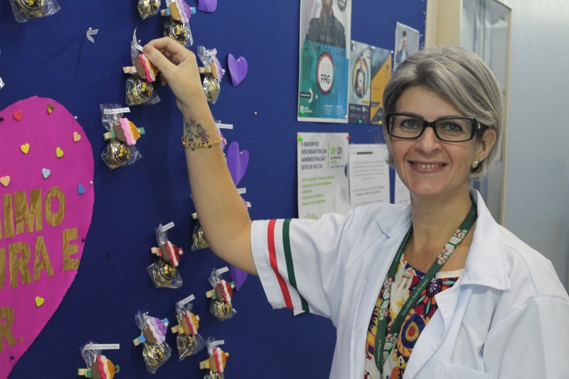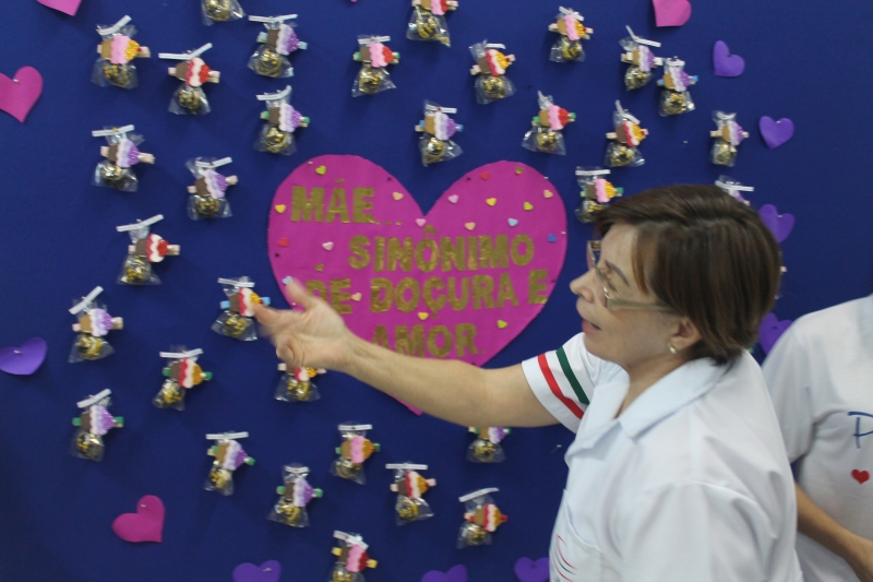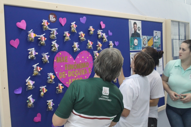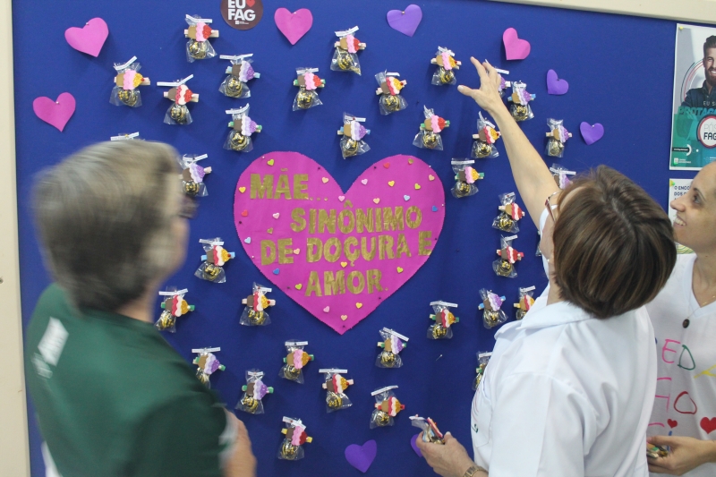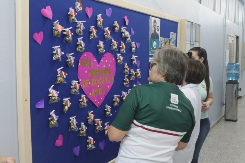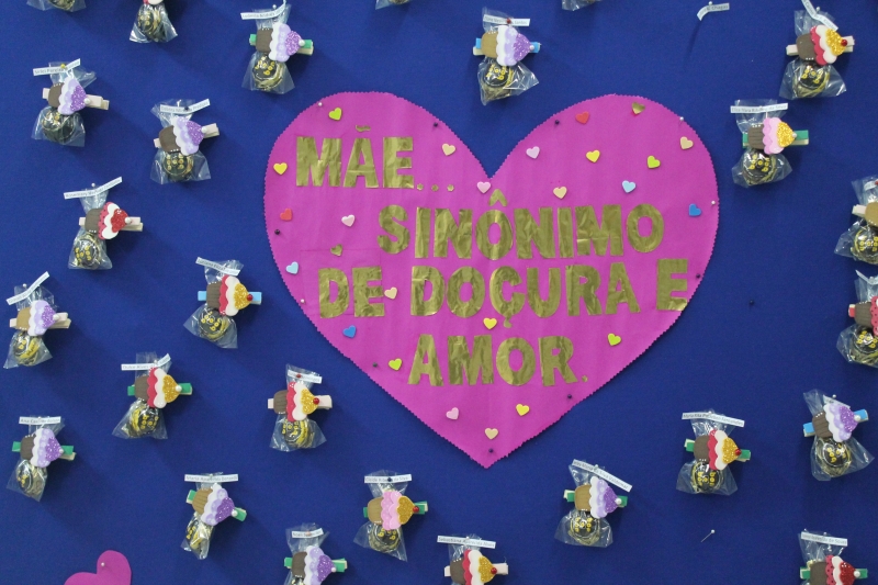 O mural que dá acesso ao setor administrativo do campus recebeu um colorido especial nesta sexta-feira (11) com a homenagem para as mamães que trabalham na instituição. O painel recebeu um coração com a frase "Mãe...sinônimo de doçura e amor" e várias lembranças feitas com EVA e chocolates e com os nomes das colaboradoras da docência, zeladoria e administrativo.