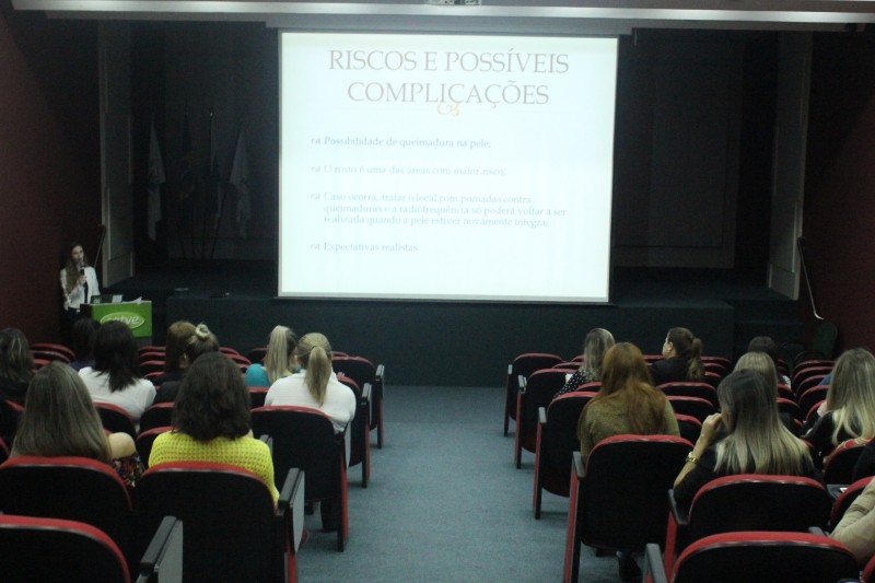 No Auditório do Bloco I, Talita Cristina Reis Pasqualini, conduziu a palestra sobre Radiofrequência. Já nos laboratórios de Estética no Bloco I, a egressa do curso de Estética, Thais Broetto, apresentou técnicas de Make-up, e Evellyn Roberta Ferreira aplicou o minicurso sobre Criofrequência. Nas Clínicas FAG, no Laboratório de Estética Corporal, as acadêmicas participaram do minicurso sobre Radiofrequência com Jaqueline Dapunicena.