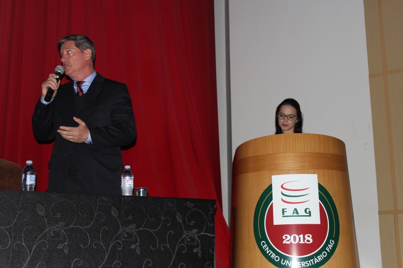 A coordenadora de Ciências Contábeis do Centro FAG, Márcia Kounrouzan e o Vice-reitor, Sérgio De Angelis compuseram a mesa de honra ao lado do Presidente da Federação dos Contabilistas do Paraná (Fecopar), Divanzir Chiminacio; do Delegado do Conselho Regional de Contabilidade do Paraná, Jovane dos Santos Borges; do Diretor Regional do Sescap-PR, Diego Maurício Paim Bottcher; do Presidente do Sindicato dos Contabilistas de Cascavel e Região, Juarez Paim da Silveira; do Vereador, Sidnei Mazutti; do Diretor do Centro de Ciências Aplicadas da Unioeste, Geysler Rógis Bertoline e, do coordenador do curso de Ciências Contábeis da Unioeste, Denis Dall?Asta.