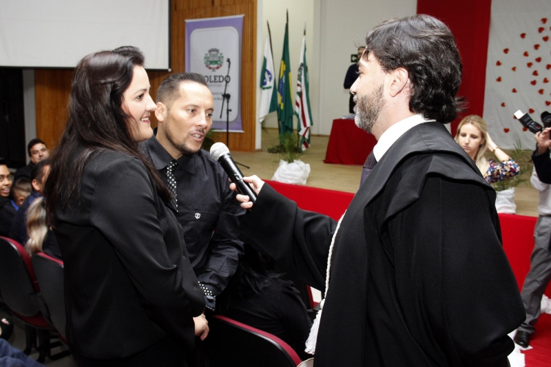 Foi realizado no último sábado (19) mais uma edição do Casamento Coletivo Comunitário de Toledo. O evento é uma parceria do Centro Judiciário de Solução e Conflitos e Cidadania (Cejusc) com o curso de Direito da FAG Toledo e a Secretaria Municipal de Assistência Social. A cerimônia foi realizada pelo juiz de direito, Rodrigo Dias que também é docente da FAG Toledo. Durante sua fala, ele ressaltou sobre o respeito e a compreensão para se levar uma vida a dois e do novo momento na vida de cada um a partir do casamento. A edição ocorreu no Centro Cultural da Vila Pioneiro, momento em que 30 casais disseram o sim diante do juiz.