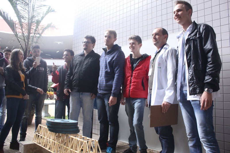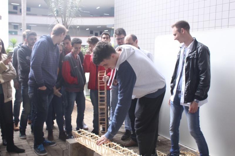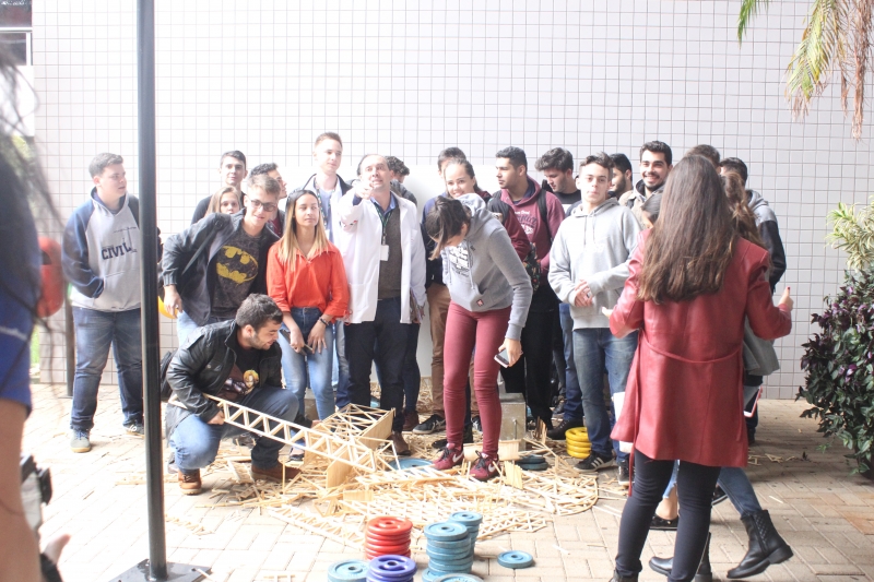 Acadêmicos dos cursos da Engenharia Civil, Mecânica, Elétrica e Controle de Automação participaram do desafio de pesos com pontes construídas com palitos de picolé. A atividade faz parte do Projeto Integrador e foi acompanhada pelos professores, Ricardo Paganin e Gilson Debastiani.