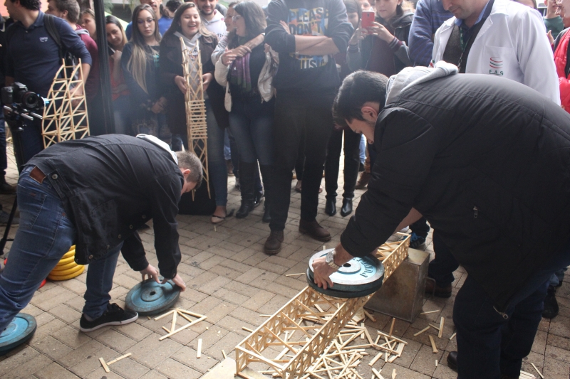 Os estudantes se reuniram no espaço de convivência do Bloco 01 e cada grupo foi avaliado a partir dos pesos que a ponte suportava, que variou entre 10 e 180 kg. A ponte da acadêmica, Adria Vitória dos Anjos, do curso de Engenharia Civil, suportou 50 kg. "Montamos a nossa ponte em três dias. Pesquisamos por desenhos e construímos. É muito bacana ver a participação de todos os cursos, além de muito aprendizado, acaba sendo uma interação entres os acadêmicos", relata.