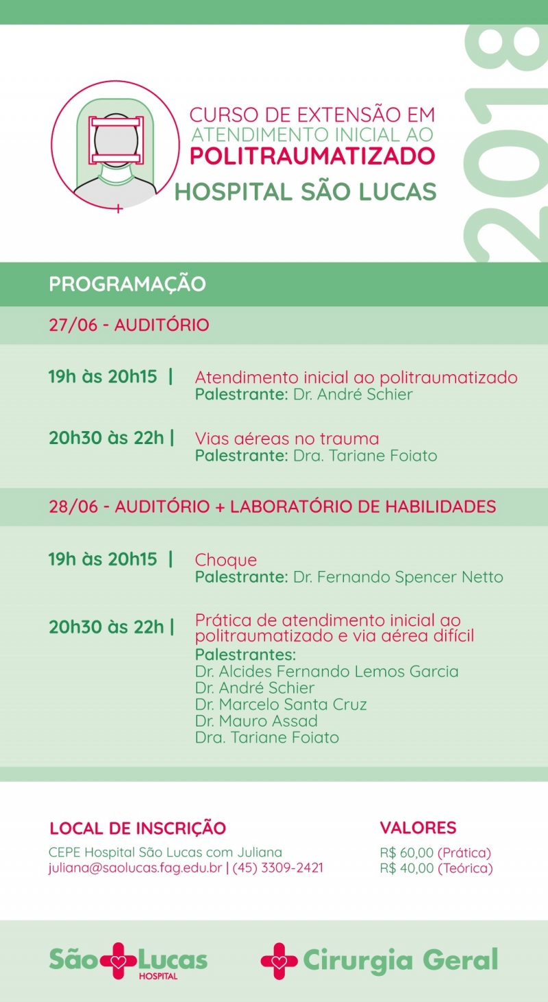 A Fundação Hospitalar São Lucas está com as inscrições abertas para o curso de "Extensão em Atendimento Inicial ao Politraumatizado", que será realizado nos dias 27 e 28 de junho. A atividade teórica será aberta para médicos, enfermeiros, fisioterapeutas e acadêmicos interessados na área "trauma", já a prática, será aberta apenas para médicos e acadêmicos do curso de Medicina. Profissionais e acadêmicos de outras instituições também podem participar do evento.