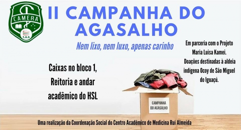O CAMERA (Centro Acadêmico de Medicina Rui Almeida), por meio do setor social, realiza, em parceria com o Projeto Maria Luísa Kamei, a 2ª edição da Campanha do Agasalho. As doações serão destinadas à Aldeia Indígena Ocoy, localizada em São Miguel do Iguaçu e que abriga mais de 120 famílias.