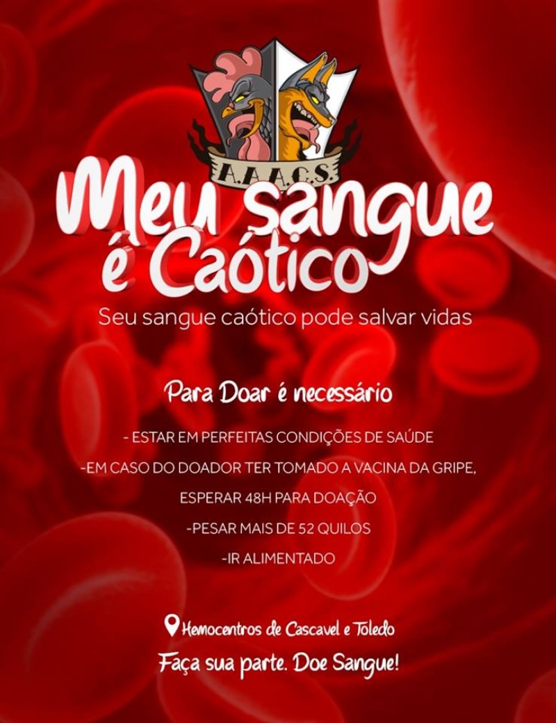 Com o tema "Seu sangue caótico pode fazer a diferença", a Associação Atlética Acadêmica de Comunicação Social do Centro Universitário FAG lançou a campanha para doação de sangue. A data de lançada não foi escolhida de forma aleatória: hoje (14) é Dia Mundial do Doador de Sangue, data para homenagear os doadores e para conscientizar os que ainda não são.